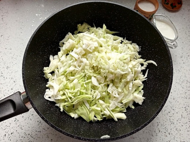 Переложите на сковороду нарезанную капусту. Сковорода у вас должна быть такого размера, чтобы вся капуста влезла и не вываливалась за бортики.
