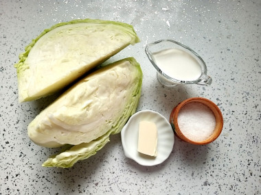Как сделать капусту со сливками? Подготовьте продукты. Сливки берите любой жирности, на свой вкус. Чем ароматнее будет сливочное масло, тем лучше. Можете заменить его топленым - мы все равно будем жарить на нем. Специи выбирайте на свой вкус, подойдут любые, которые используются для вторых блюд из овощей. Капусту очистите от верхних листьев, обмойте и обсушите. Срежьте подсушенную часть кочерыжки.