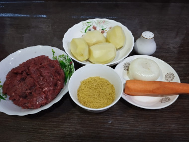 Для начала подготовьте необходимые ингредиенты по списку. Лапшу можете заменить рисом, гречкой или другой крупой. Какой фарш лучше на суп с фрикадельками? Я сделала фарш самостоятельно, пропустив куриное филе через мясорубку. Можете взять готовый магазинный фарш. Куриный фарш можете заменить на фарш из других видов мяса или смешанный.