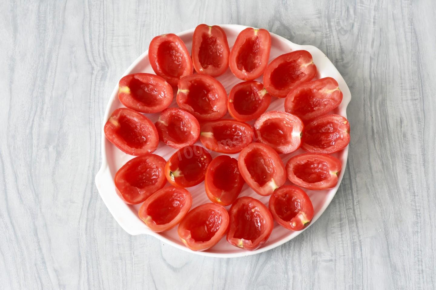 Помидоры вымойте. Если помидоры небольшие, разрежьте их вдоль пополам, если средние и крупные - нарежьте четвертинками. Чайной ложкой удалите семена.