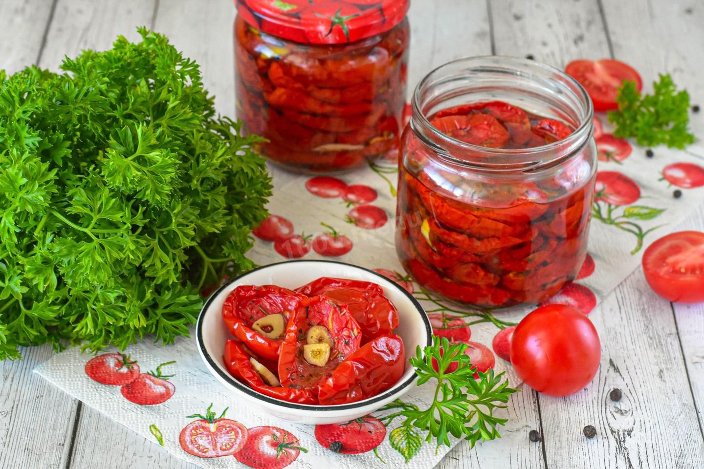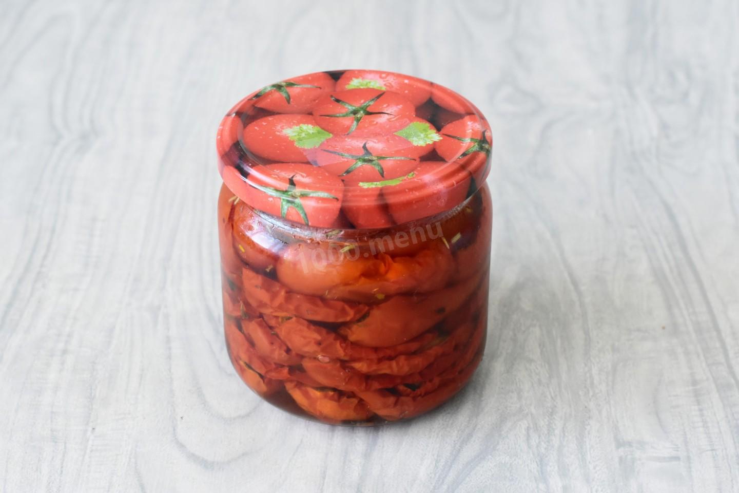 Вяленые помидоры разложите по заранее простерилизованным баночкам и залейте доверху оливковым маслом. Баночки лучше брать небольшие. Банки закройте завинчивающимися крышками или закатайте жестяными крышками с помощью ключа. Поставьте банки в холодильник на 3-5 дней, чтобы помидоры промариновались.