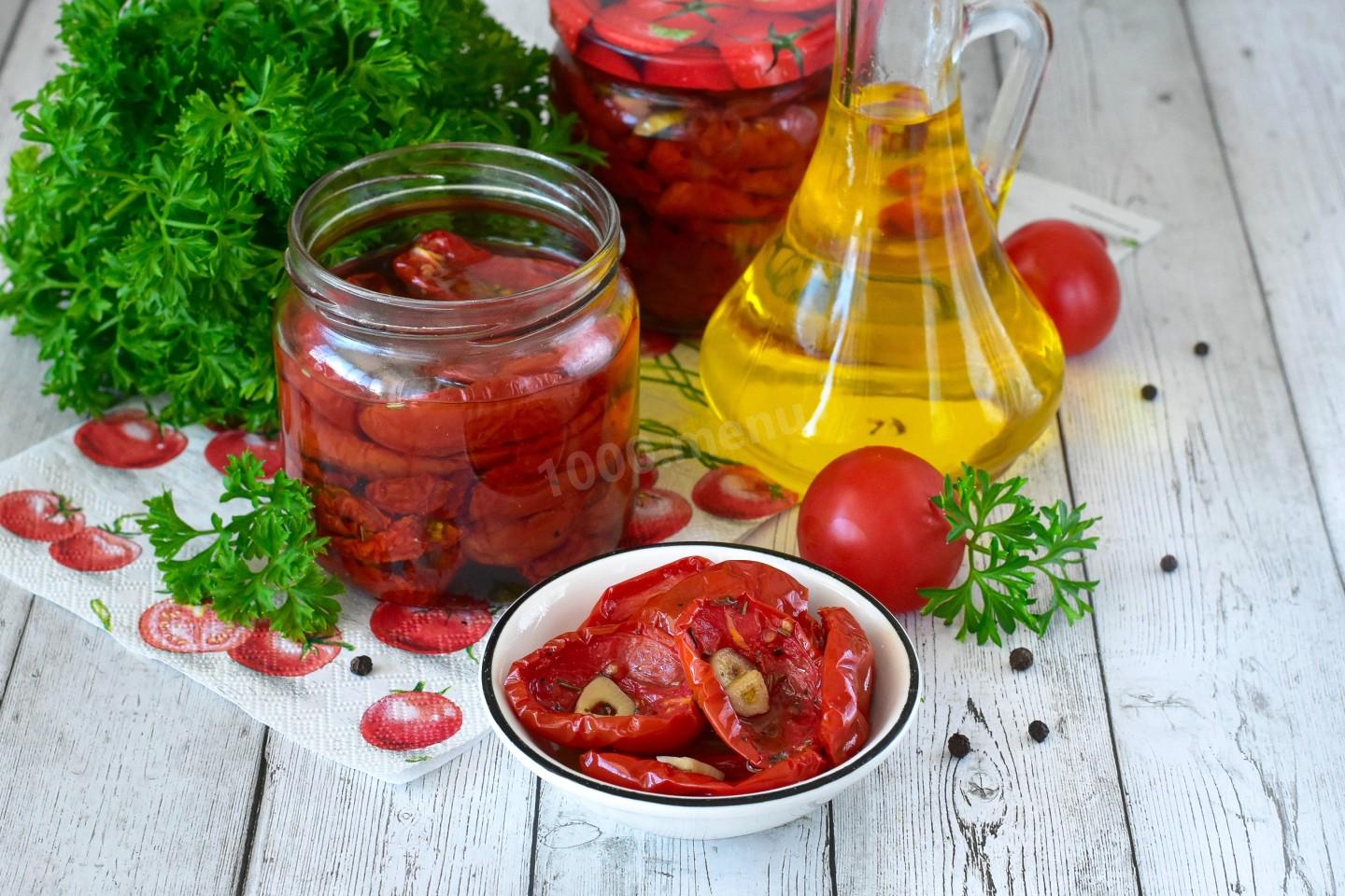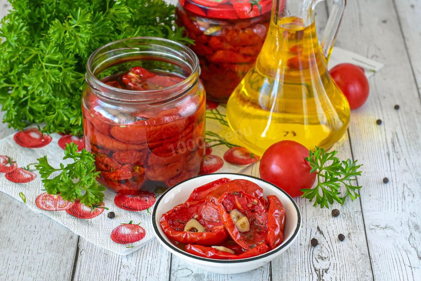 Закрытые банки хранить в темном прохладном месте (погреб, кладовая). После вскрытия – только в холодильнике, обязательно следить, чтобы томаты были полностью покрыты маслом. Срок хранения в холодильнике – до 6 месяцев. Приятного аппетита!