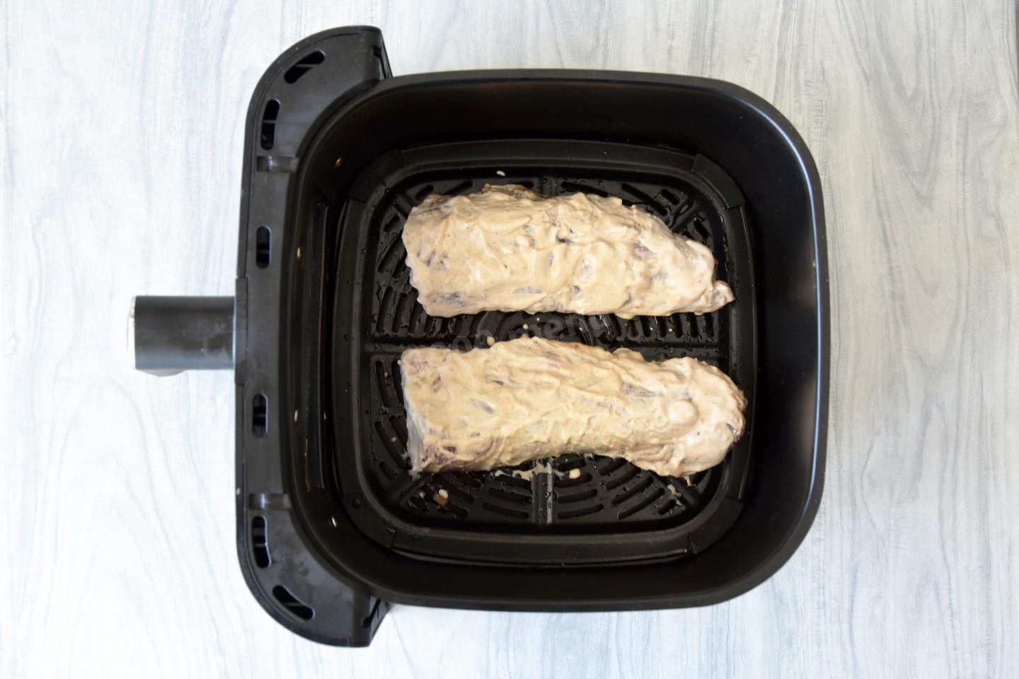 Оставьте свинину мариноваться при комнатной температуре на 1 час. Если маринуете дольше, то затяните миску пищевой пленкой и поставьте в холодильник. Выложите промаринованное мясо в чашу аэрогриля.