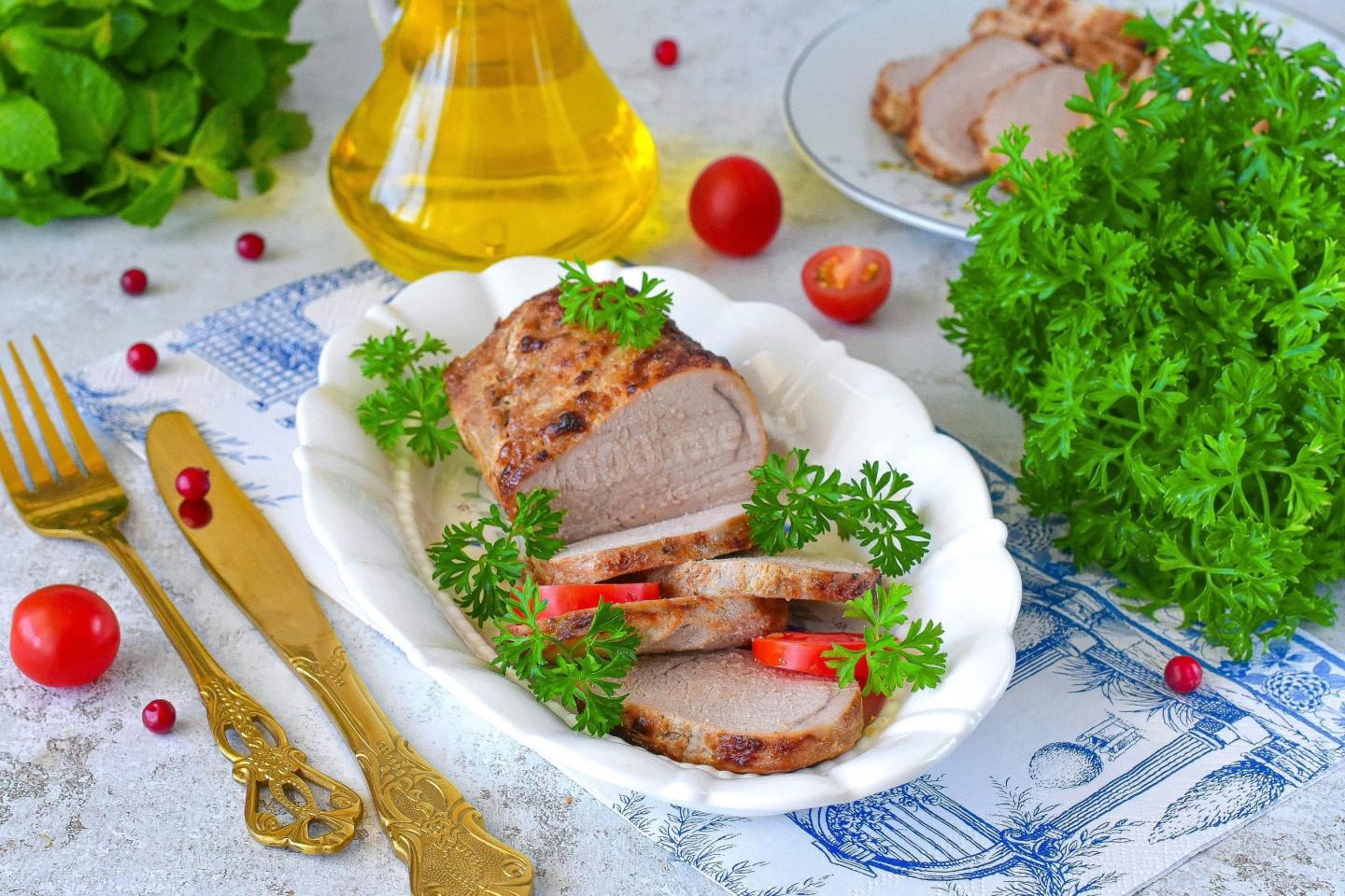 Свиную вырезку, запеченную в аэрогриле, нарежьте ломтиками, украсьте свежей зеленью и подавайте к столу. Приятного аппетита!