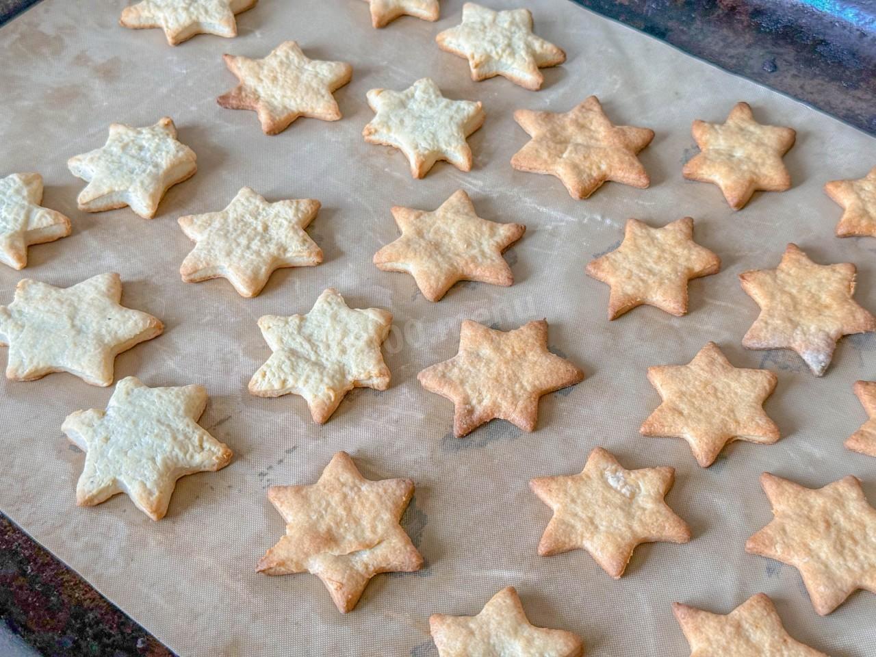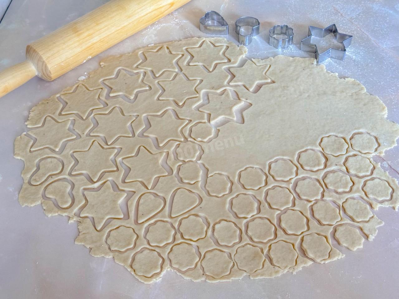 Раскатайте тесто при помощи скалки в пласт толщиной от 5 мм до 1 см. У меня толщина раскатки 5 мм. Чтобы было проще раскатывать тесто, присыпайте поверхность стола и теста мукой. Форму печенья легко вырезать при помощи специальных форм или стакана. Третий вариант - нарезать тесто на ромбы/квадраты при помощи ножа. Выложите печенье на пергамент близко друг к другу, так как в размере оно будет увеличиваться незначительно.
