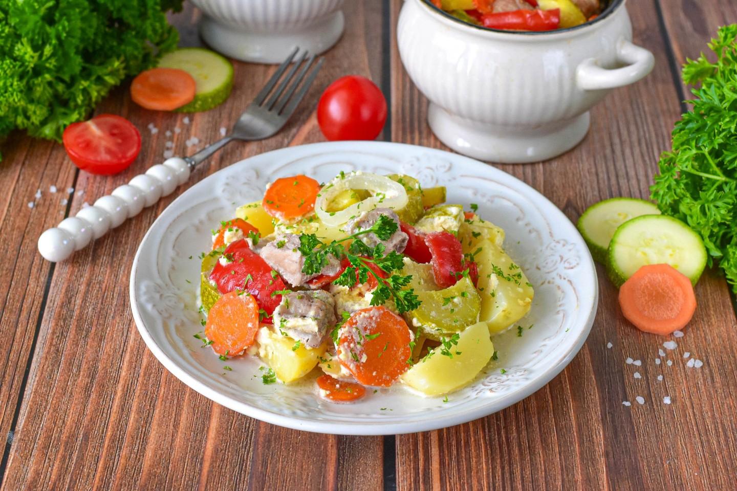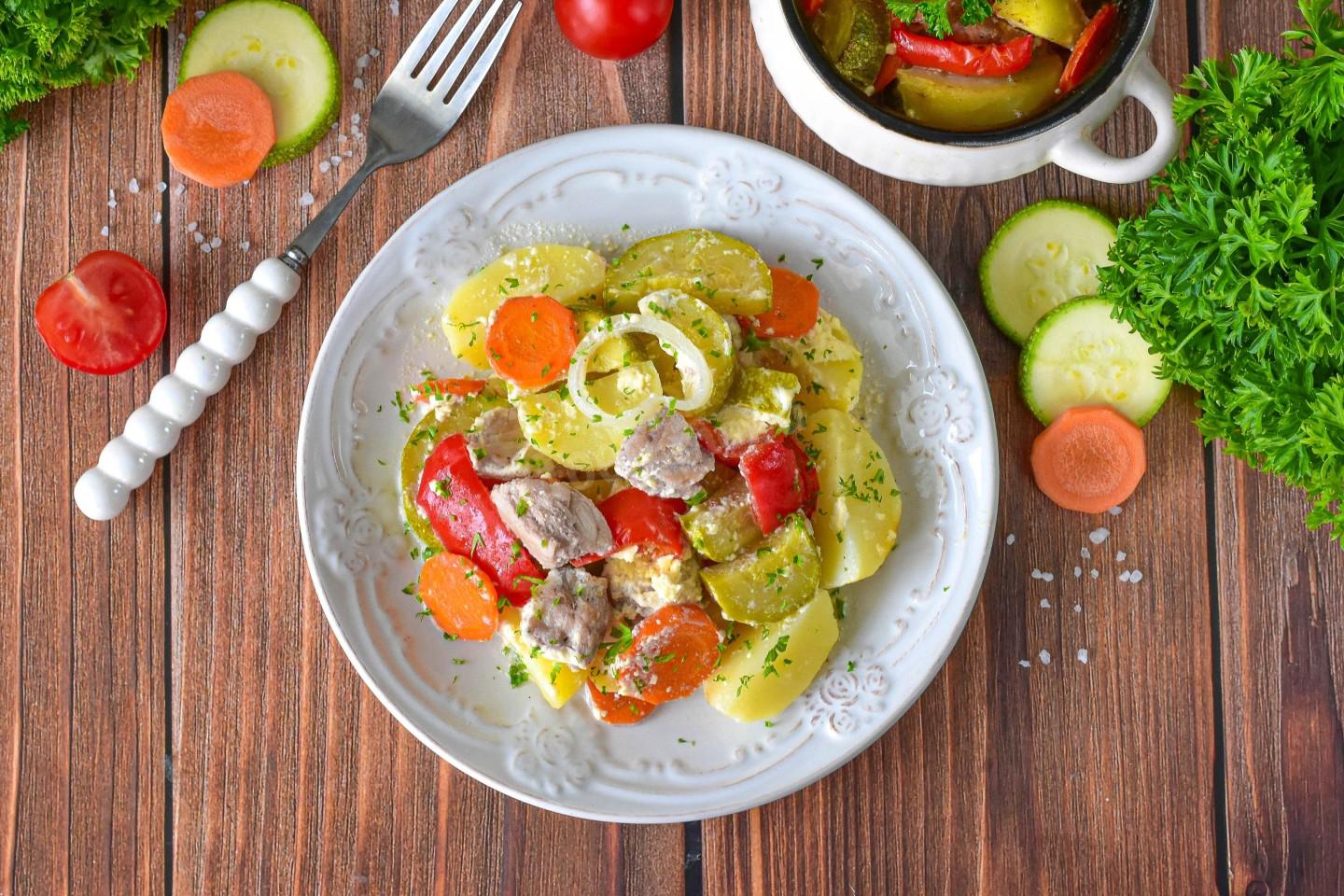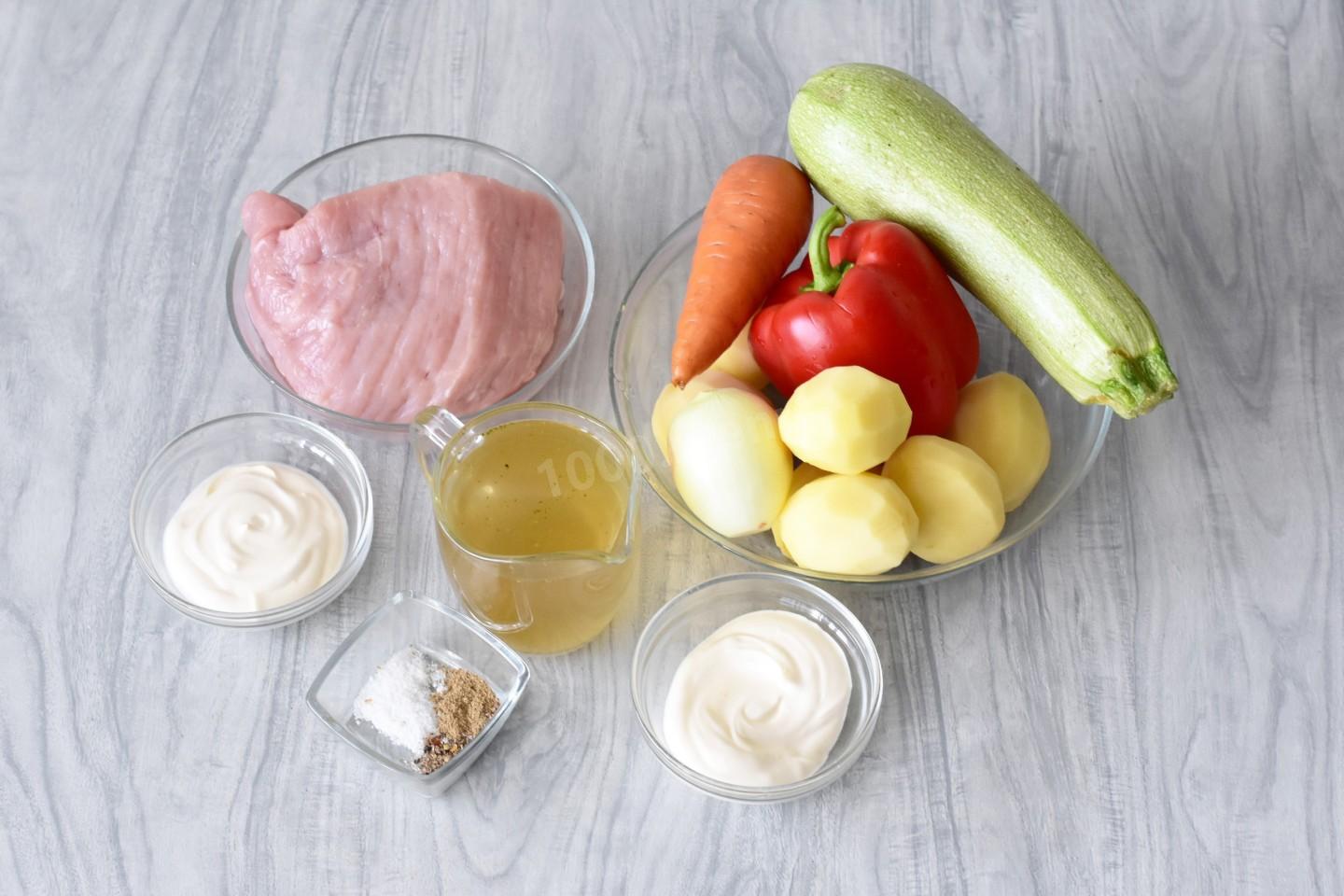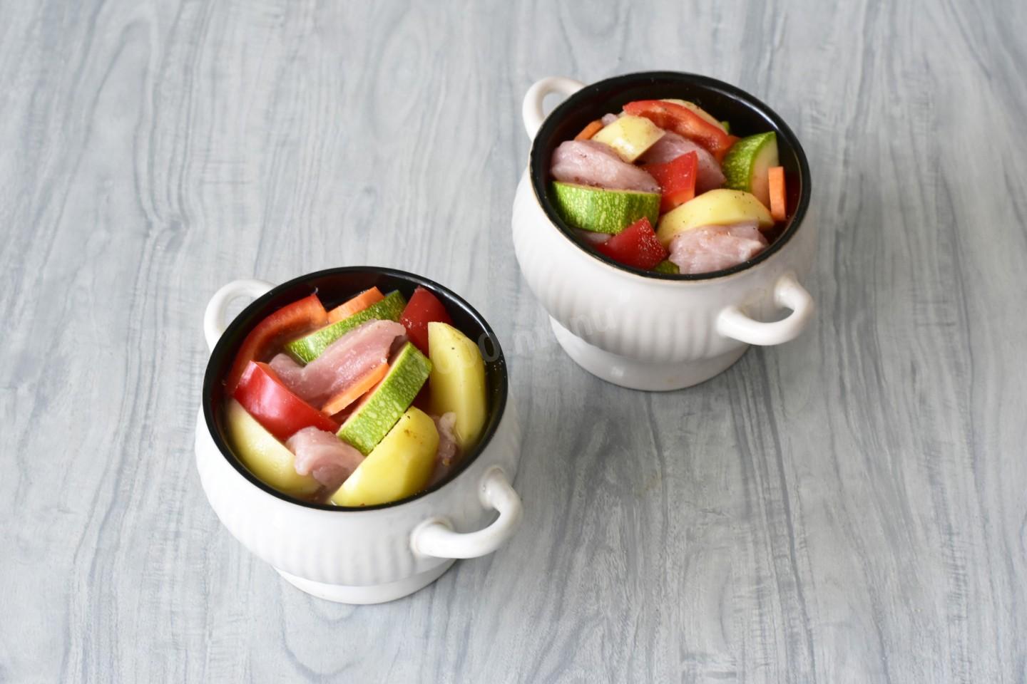 На дно горшочков или в один большой горшок выложите кольца лука, половину кабачков, моркови, картофеля, болгарского перца и мяса. Все посолите, Рецепты домашнего майонеза можно найти после описания последнего шага. Поверх распределите оставшиеся овощи и свинину. Посолите и поперчите. Влейте в каждый горшочек немного бульона. Закройте горшочки крышками и поставьте в чашу аэрогриля на решетку.