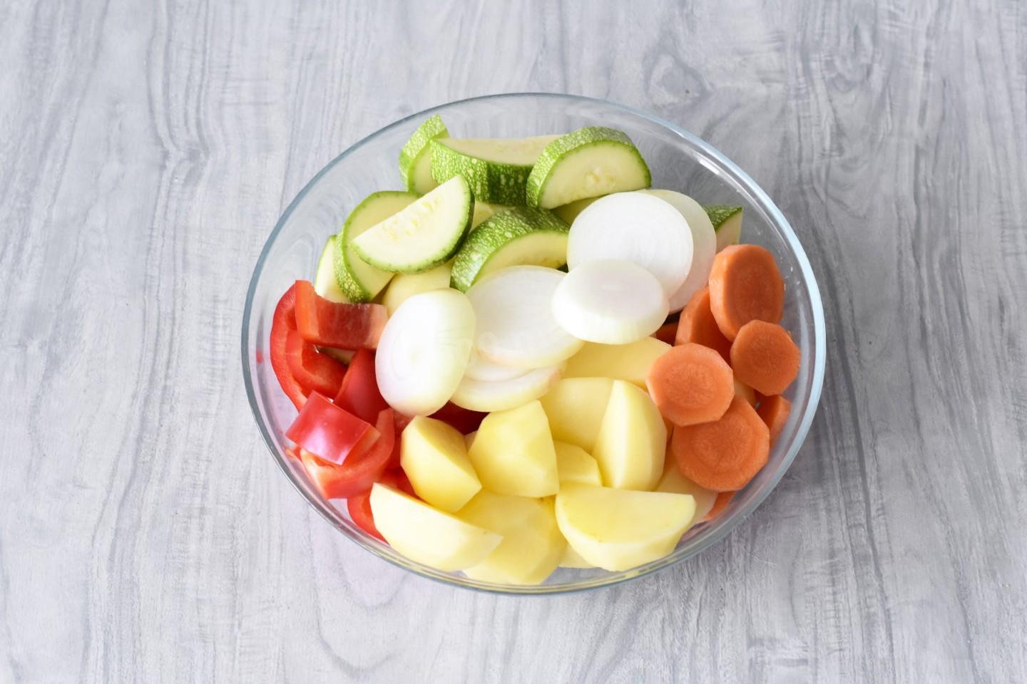 Картофель очистите и нарежьте четвертинками. Кабачок вымойте и нарежьте полукружьями. Болгарские перец очистите от семян и плодоножки и нарежьте крупными кусочками. Морковь очистите и нарежьте кружочками. Лук очистите и нарежьте кольцами.