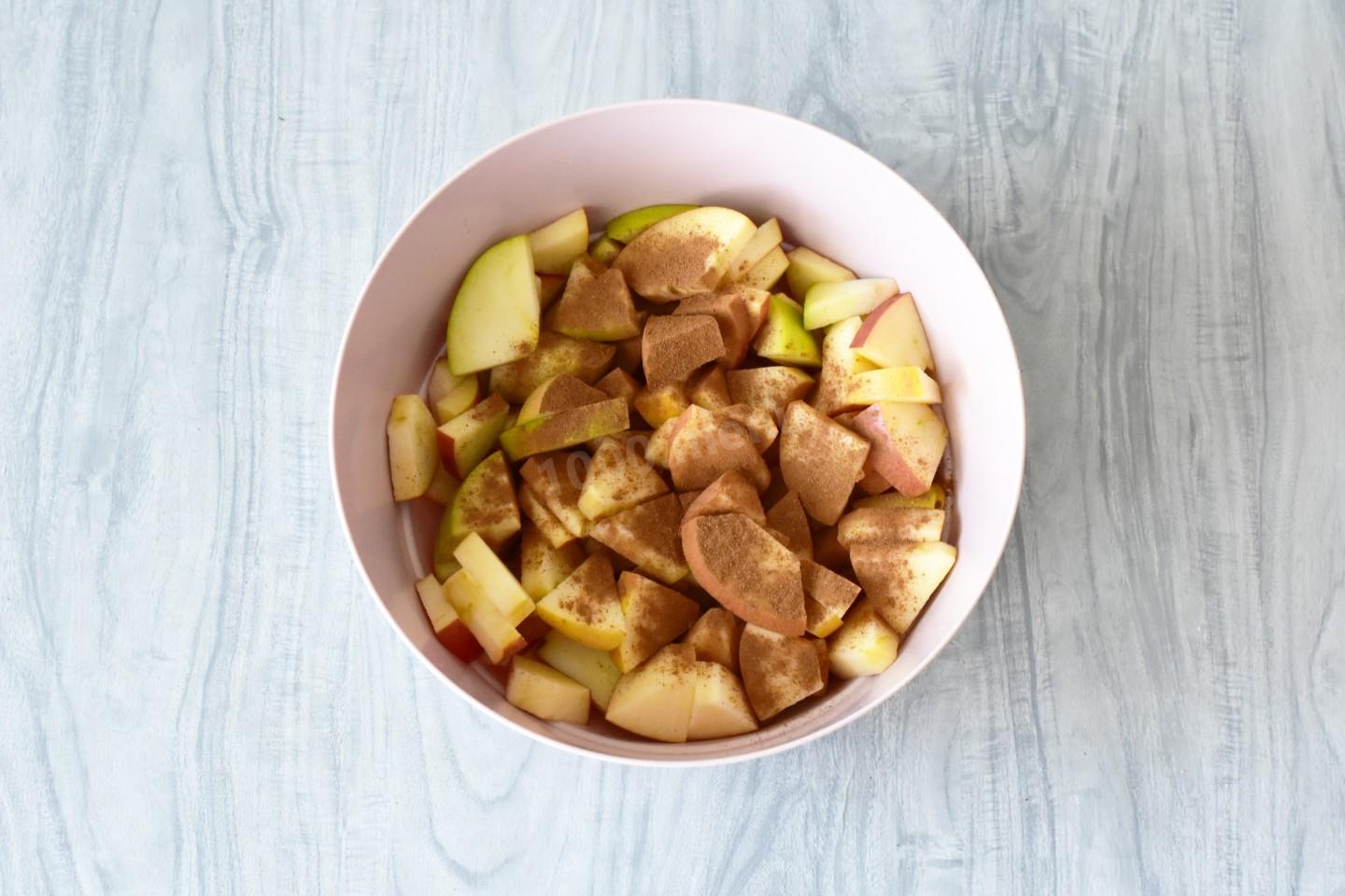 Яблоки вымойте, очистите от кожуры, удалите сердцевину и нарежьте средними кусочками. Я не счищала кожуру, т.к. у моих яблок она тонкая. Всыпьте в яблоки корицу и перемешайте. Если яблоки крупные, достаточно 3 штук. У меня 4 средних яблока. Яблоки можете брать одного сорта или разных. Главное, чтобы они были вкусные, душистые и сочные. Выложите в тесто подготовленные яблоки с корицей и аккуратно перемешайте все лопаткой.