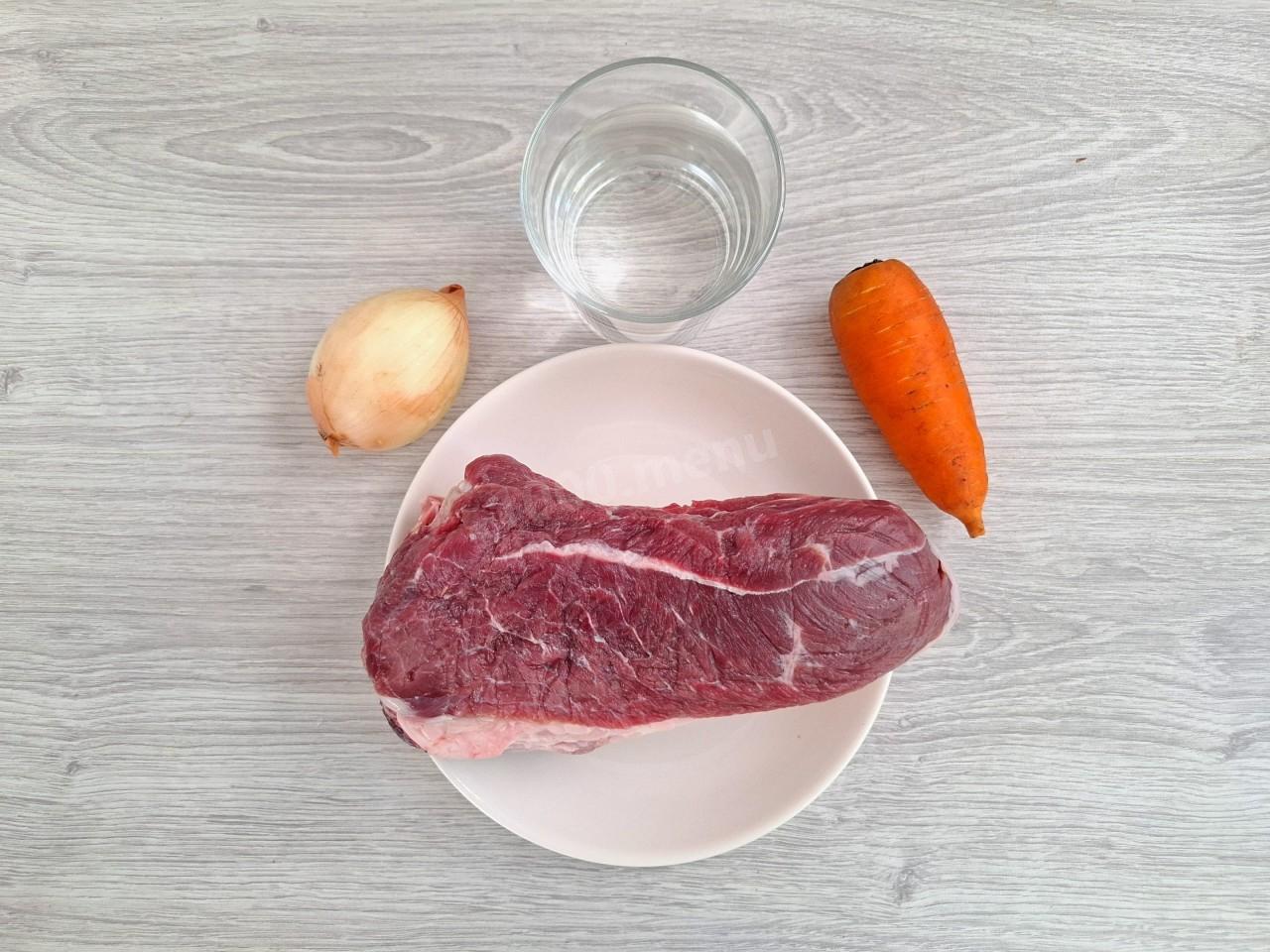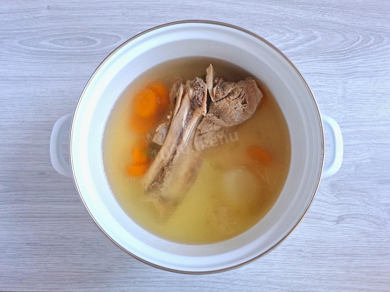 Промойте мясо, выложите в кастрюлю и залейте чистой водой. Доведите до кипения, нагрев убавьте и снимите пену. Морковь очистите от кожуры, с луковицы снимите шелуху. Выложите овощи в бульон и варите на минимальном нагреве около 1-1,5 часов. Время зависит от особенностей работы вашей плиты и жесткости мяса. Затем мясо и овощи достаньте из кастрюли, а бульон процедите через марлю. Можете снять мясо с кости и добавить его в кастрюлю в конце варки супа.