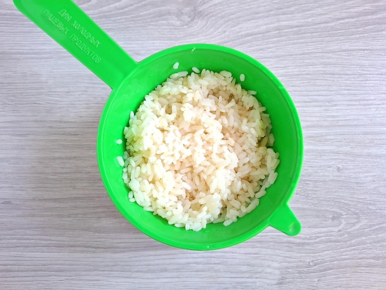 Рис хорошо промойте и залейте чистой водой в отдельной кастрюльке. Доведите до кипения, затем нагрев убавьте и варите примерно 8-10 минут. Время зависит от особенностей работы вашей плиты и сорта риса. Рис откиньте на сито, промойте и дайте воде стечь.