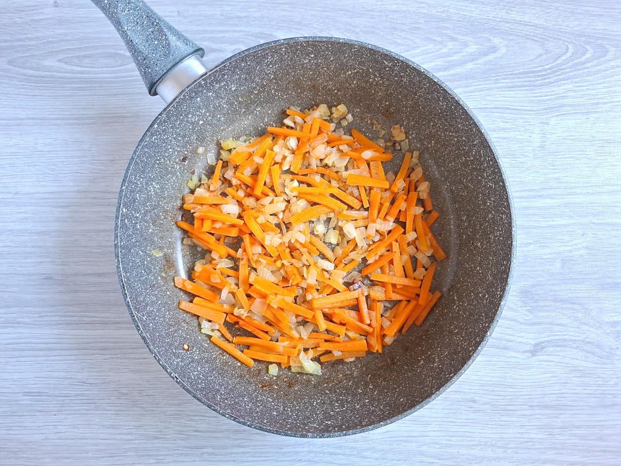 Морковь вымойте и очистите от кожуры, затем нарежьте брусочками. Луковицу очистите от шелухи и нарежьте небольшими кубиками. Сковороду с маслом нагрейте на среднем огне и выложите овощи. Обжаривайте около 5-7 минут до золотистого цвета. С выбором сковороды и масла вам помогут статьи по ссылкам под описанием рецепта.