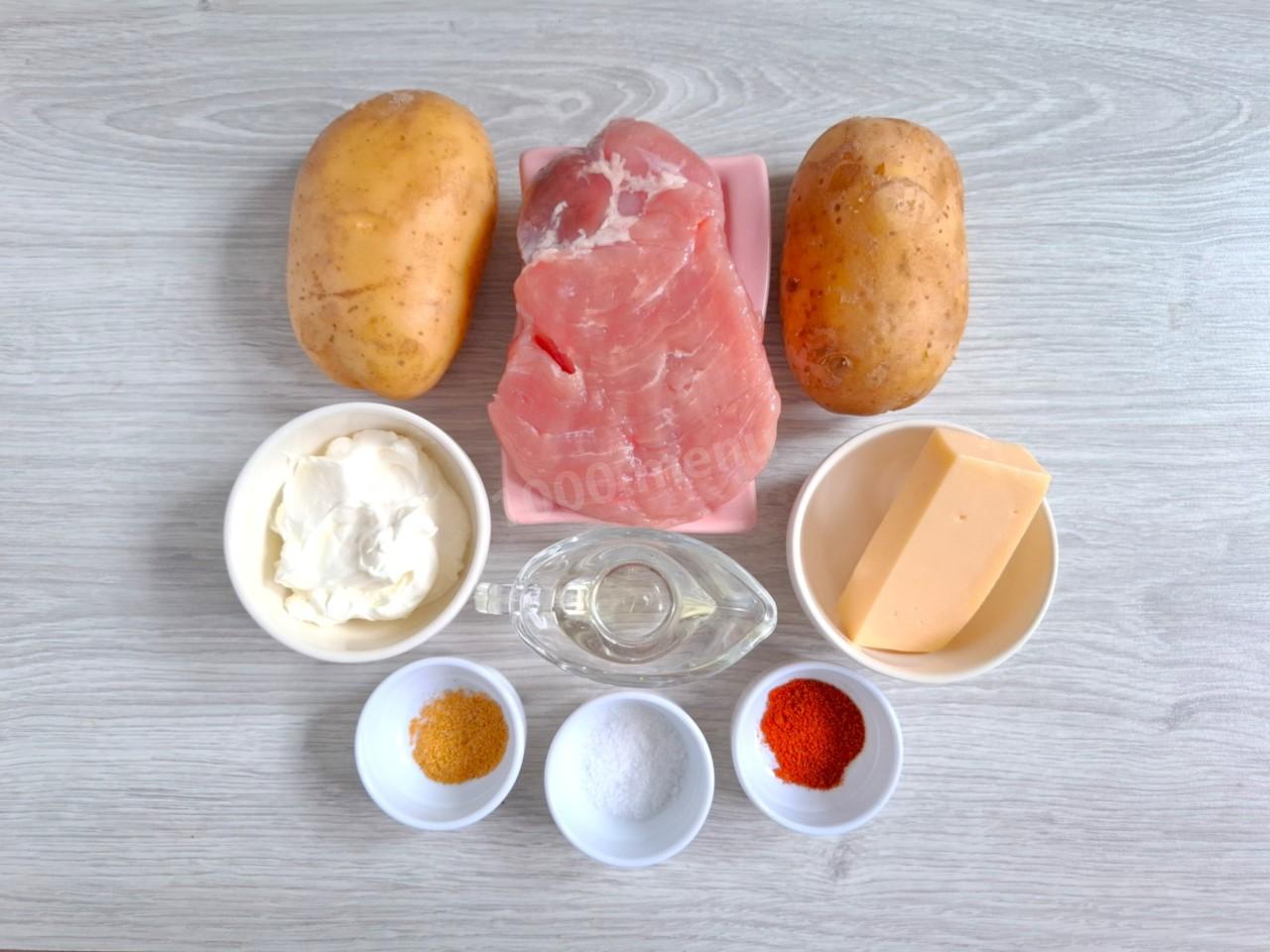 Подготовьте необходимые ингредиенты. Кроме свинины можно взять любое другое мясо, но время приготовления и калорийность изменятся. Если мясо заморожено, предварительно разморозьте его на нижней полке холодильника. Сыр берите любой, главное, чтобы он был качественным, без растительных добавок и хорошо плавился. Специи выбирайте на свой вкус. О выборе картошки и сыра читайте ниже. Там же найдёте статью о правильной разморозки продуктов.