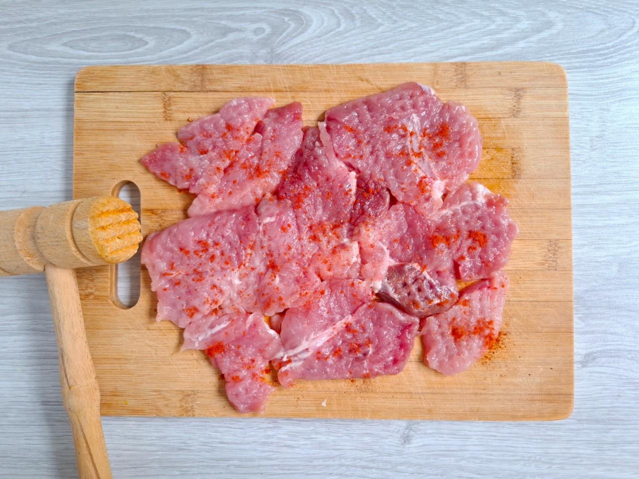 Мясо промойте в холодной воде и хорошо обсушите бумажным полотенцем. Нарежьте мясо ломтиками поперек волокон шириной около 1 см. Накройте ломтики пищевой пленкой и слегка отбейте кулинарным молотком. Присыпьте мясо паприкой и солью по вкусу.