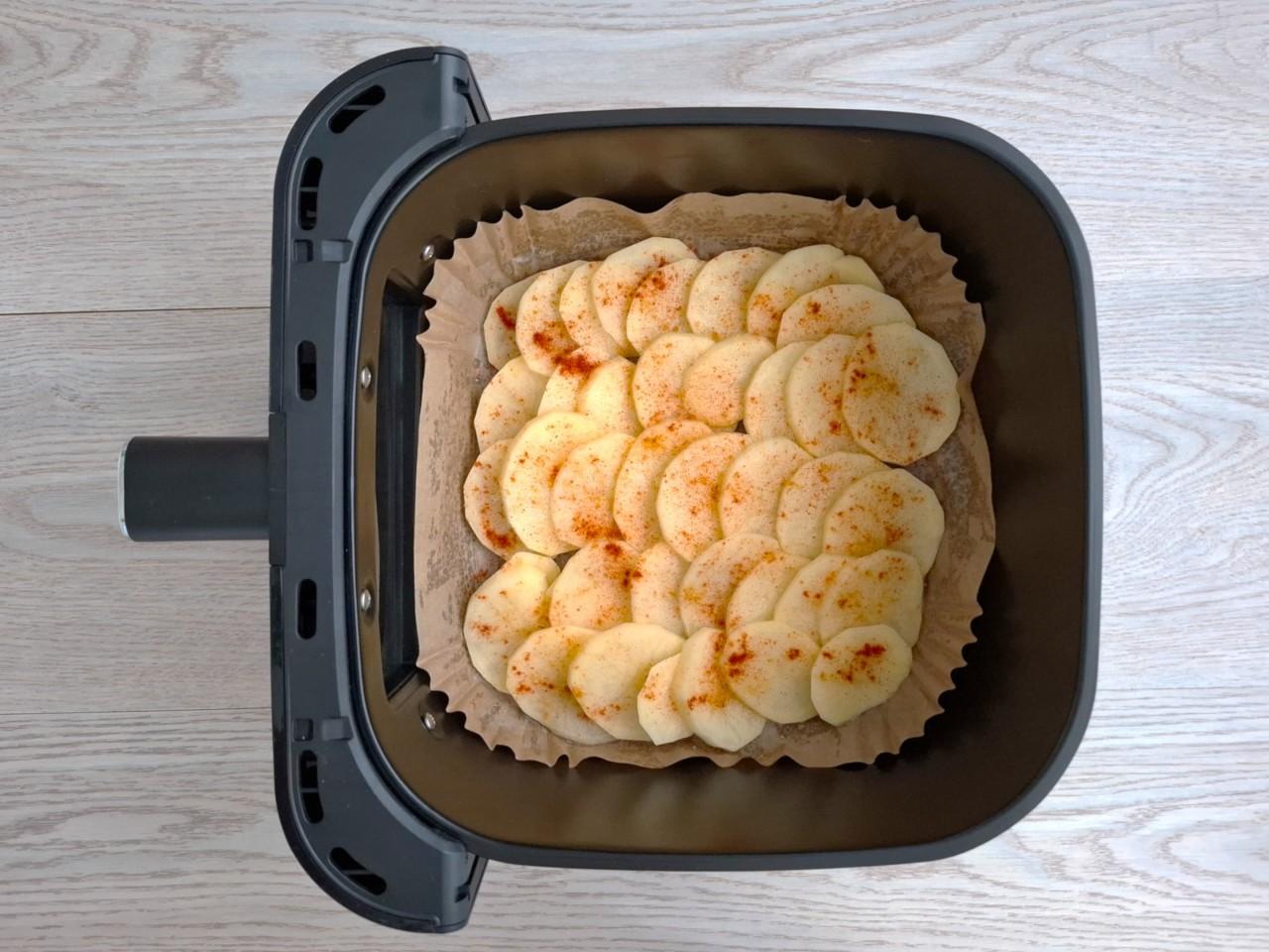 Картошку почистите, помойте, обсушите бумажными полотенцами и нарежьте ломтиками толщиной примерно 0,5 см. Дно чаши аэрогриля застелите пергаментом и смажьте его растительным маслом. Выложите картошку на дно чаши немного внахлест в один ряд. Присыпьте картошку паприкой, специями и солью по вкусу. Подробнее о выборе пергамента и растительного масла читайте в статьях по ссылкам под шагами.