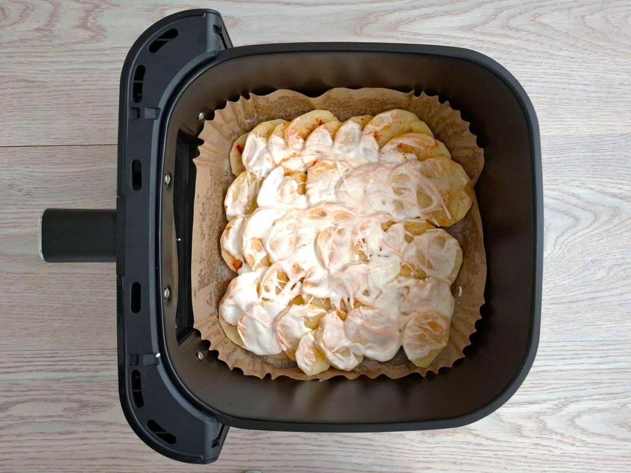 Смажьте слой картошки 2 ст. л. сметаны. Сметана может быть любой жирности. Информацию о выборе сметаны вы можете прочитать в статье под описанием рецепта. По желанию можете заменить ее майонезом. Запекайте картошку в аэрогриле около 20 минут при 200℃ до золотистой корочки. Подробнее о работе аэрогриля читайте в материале по ссылке ниже.