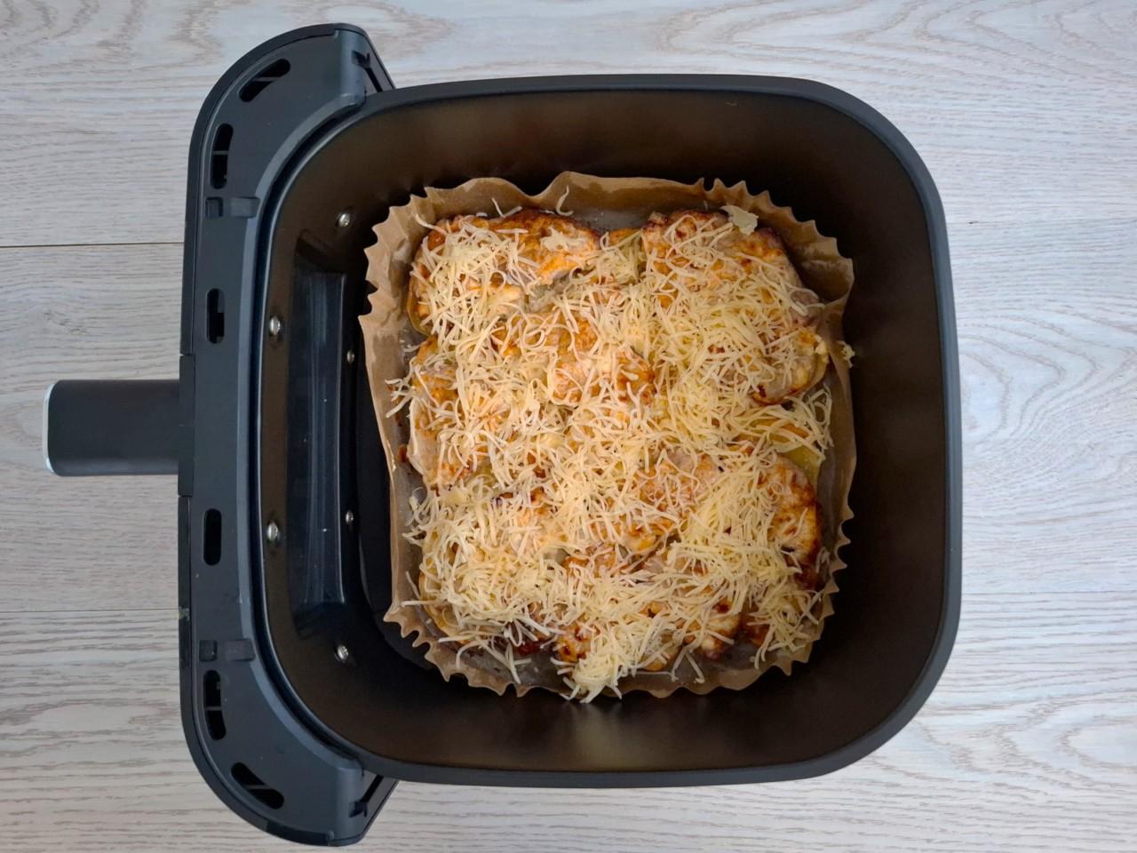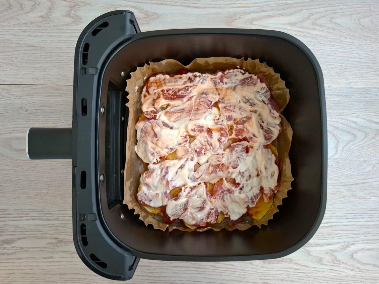 Достаньте чашу из аэрогриля и выложите мясо поверх картошки. Сверху распределите остатки сметаны. Сколько готовить мясо по французски в аэрогриле на этом этапе? Запекайте еще около 10-15 минут до румяного цвета, снизив температуру до 180℃. Время и температура выпекания могут отличаться в зависимости от особенностей работы аэрогриля.