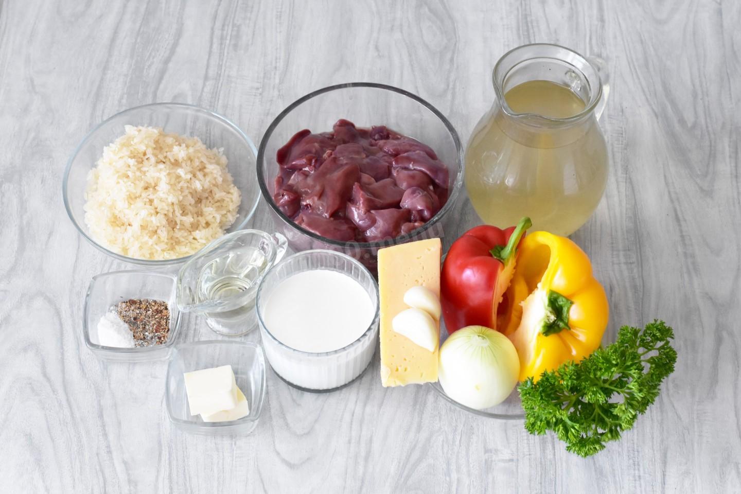Для начала подготовьте необходимые ингредиенты по списку. У меня пропаренный длинозерный рис. Правильно подобрать рис и специи к нему помогут соответствующие статьи. Ссылки есть в конце рецепта. Куриную печень можете заменить на свиную, говяжью или индюшачью. Овощную часть можете дополнять или заменять по своему вкусу. Подойдет морковь, кабачок и т.д. Секреты приготовления вкусного домашнего бульона вы узнаете из статьи по ссылке ниже.