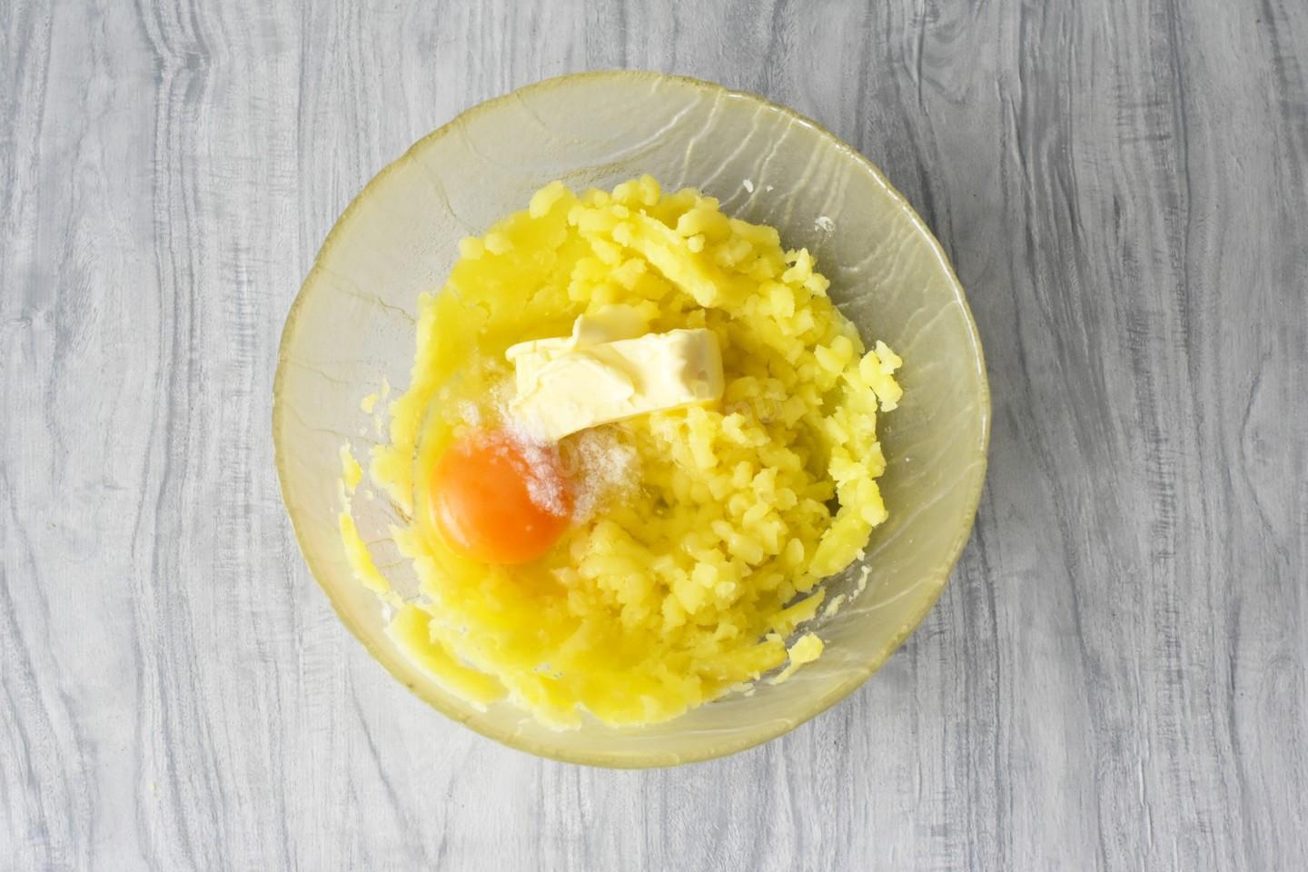 Картофель разомните в пюре с помощью толкушки. Добавьте в пюре сливочное масло, яйцо и соль. Перемешайте.