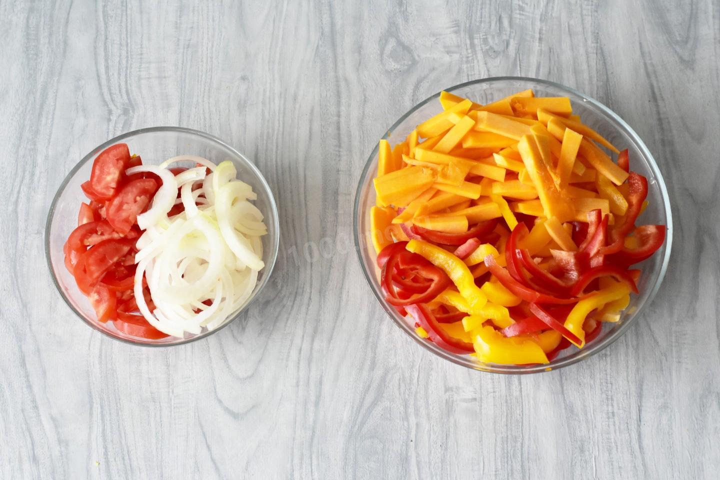 Все овощи очистите. Тыкву и болгарский перец нарежьте соломкой. Помидоры нарежьте небольшими ломтиками. Лук нарежьте полукольцами. Овощную часть можете заменять или дополнять по своему вкусу.