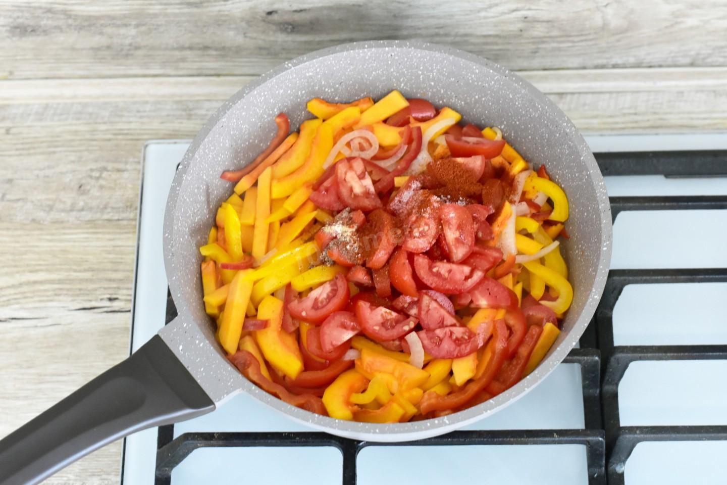 В сковороде на среднем огне разогрейте растительное масло. Выложите лук и обжарьте до прозрачности. Добавьте тыкву и болгарский перец и жарьте все вместе, помешивая, 3-5 минут. О том, как подобрать идеальную сковороду, читайте в статье, ссылка в конце рецепта. В конце добавьте помидоры и специи и жарьте, помешивая, 2-3 минуты. Сковороду уберите с огня, начинку охладите. Специи можете подбирать по вкусу.