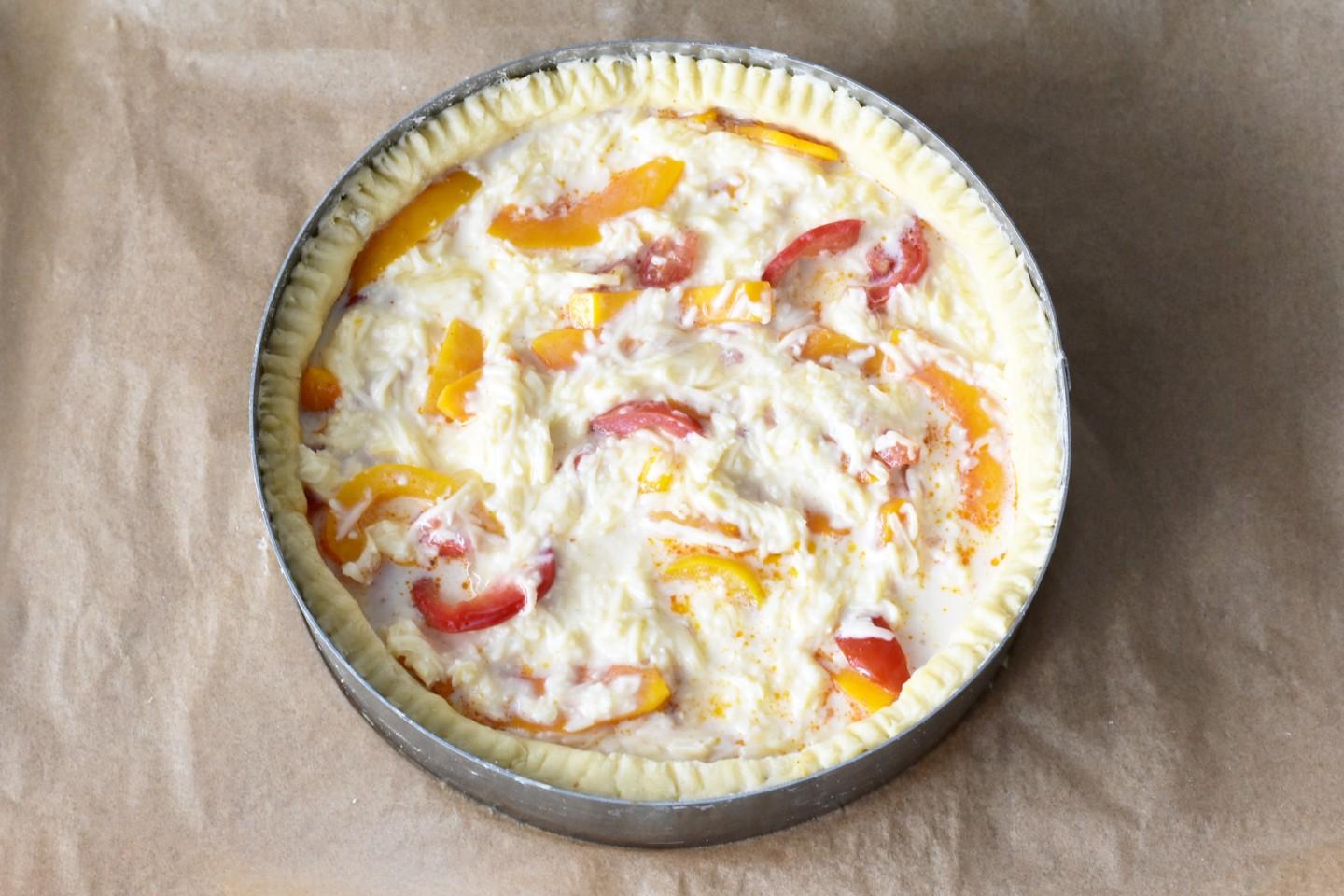 Тесто распределите по форме для выпечки (Ø 20 см) и сделайте высокие бортики. Я для подобных пирогов использую кулинарные кольца. Из них вынимать пирог удобнее. Подробную информацию о подборе подходящих форм для выпечки вы найдете в статьях по ссылкам в конце рецепта. На начинку аккуратно вылейте молочно-сырную смесь. На тесто выложите овощную начинку и разровняйте.