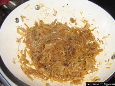 Репчатый лук нарезаем полукольцами и обжариваем в растительном масле.
