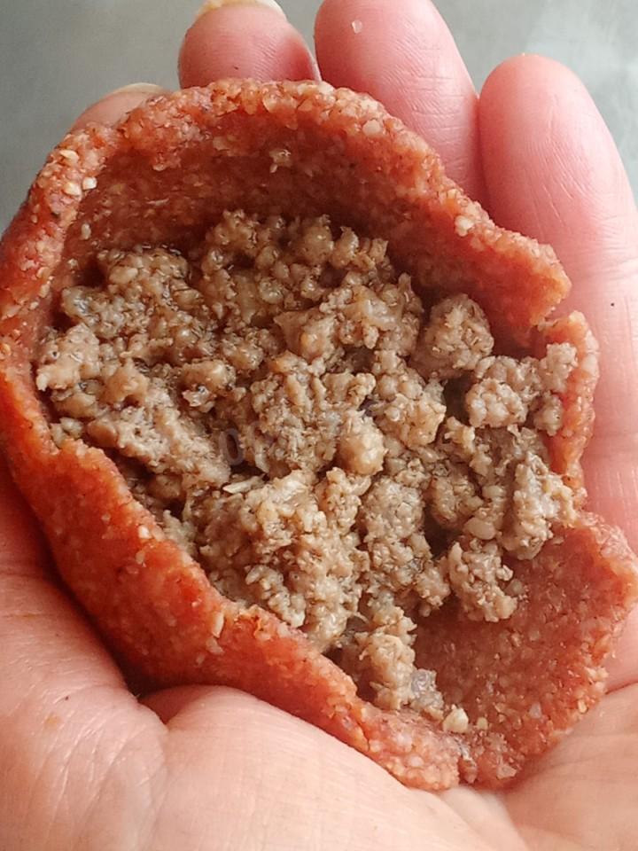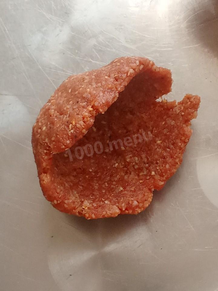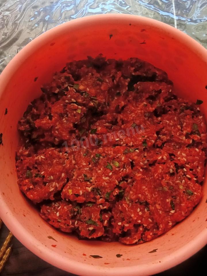 Для корки мясо 2 раза отпускаем на месорубке добавляем булгур,соль,спецы и смешиваем 15 минут.После мясо с булгур ом отпускаем на месорубке.