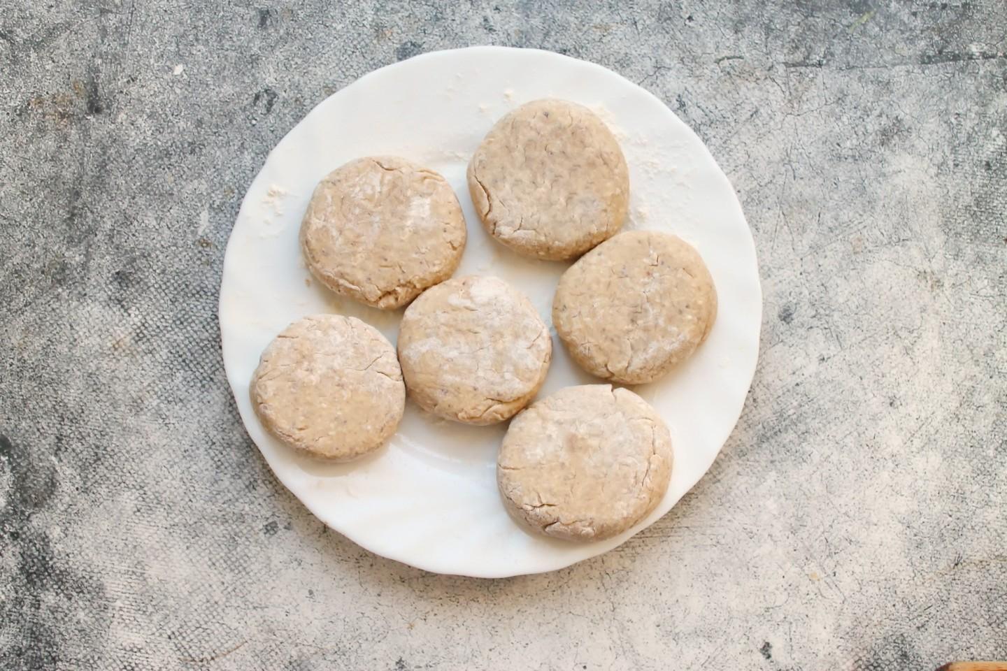Сформируйте шар, а затем приплюсните его в толстую лепешку. Бока получатся неровными, "рваными" — это нормально.