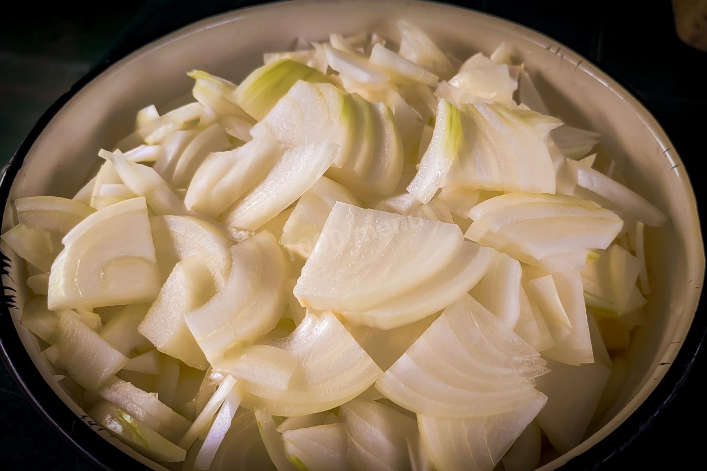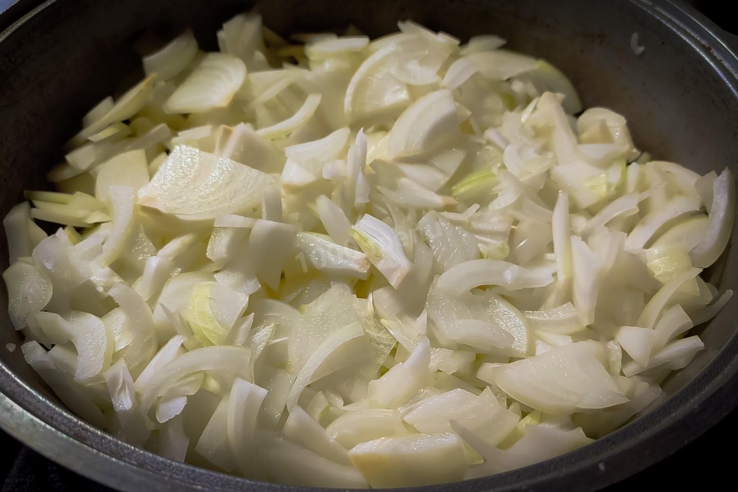 Теперь в кастрюлю всыпать весь лук. По количеству его будет много, но в процессе приготовления объём лука сильно уменьшится (!). Лук прожаривать при сильном огне, периодически перемешивая.