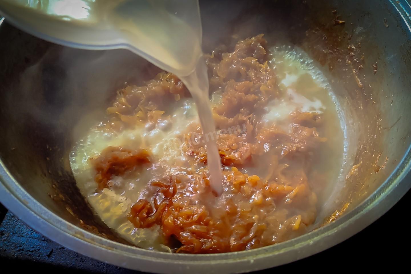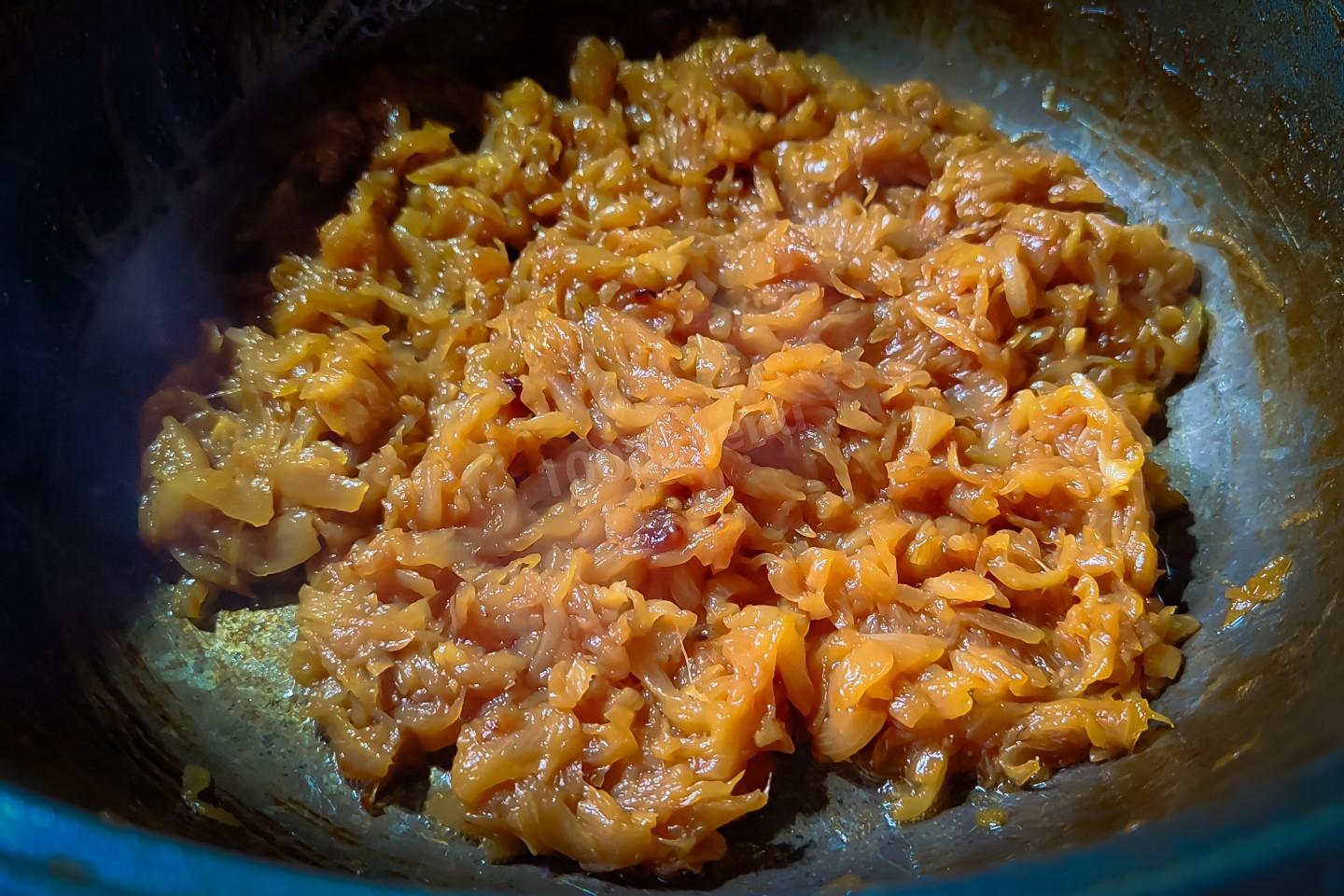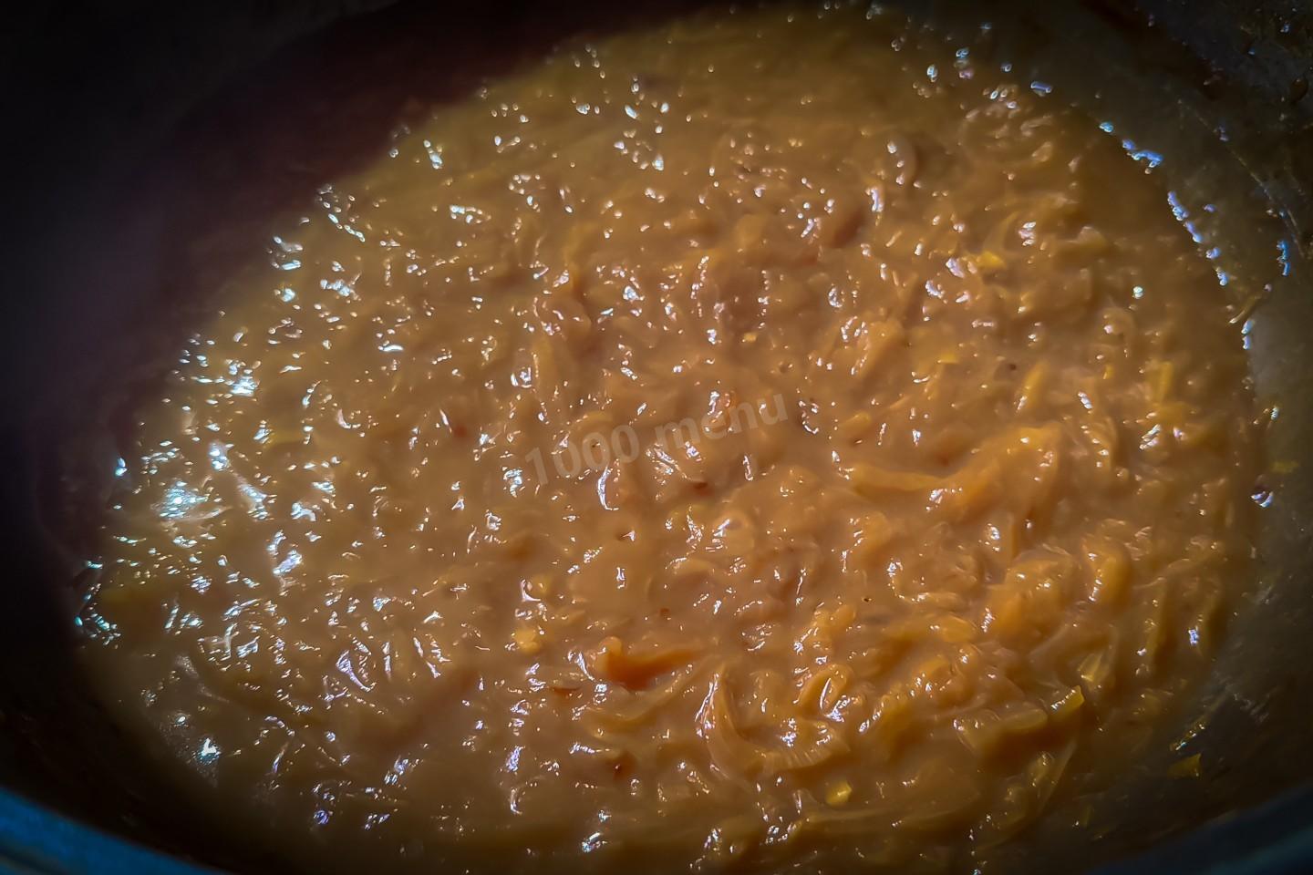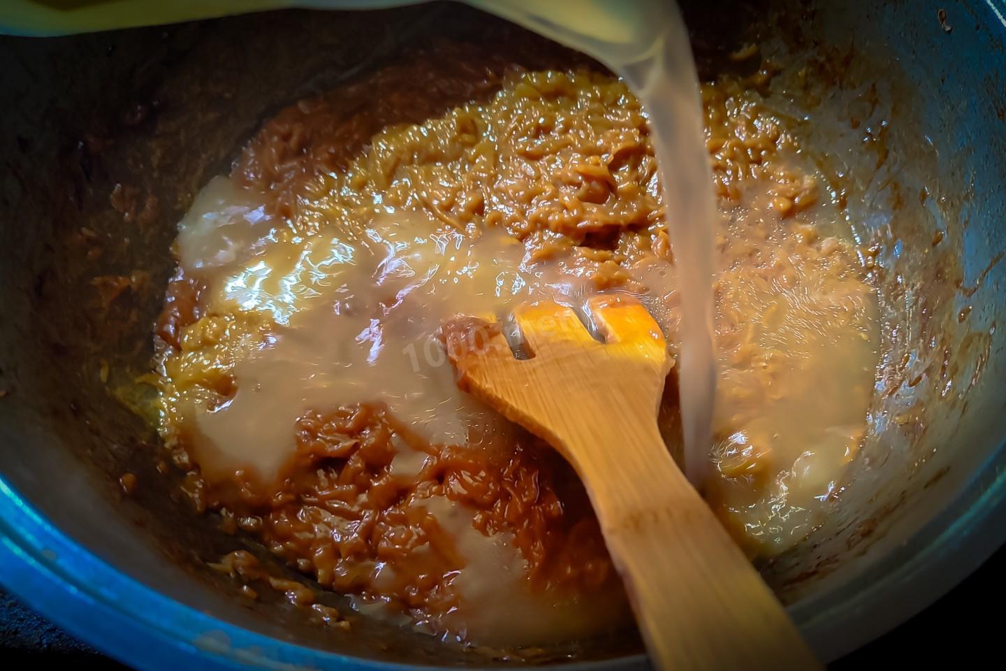 Когда лук примет коричневый оттенок, но не подгорит (у меня на это ушло 1,5 часа), можно приступать к следующим шагам.