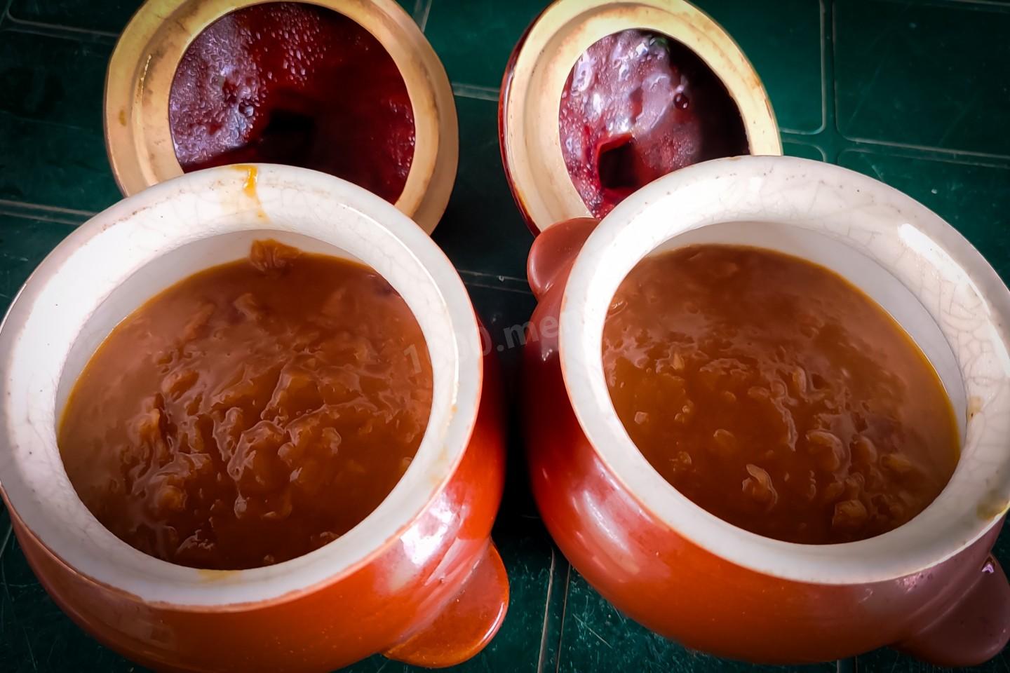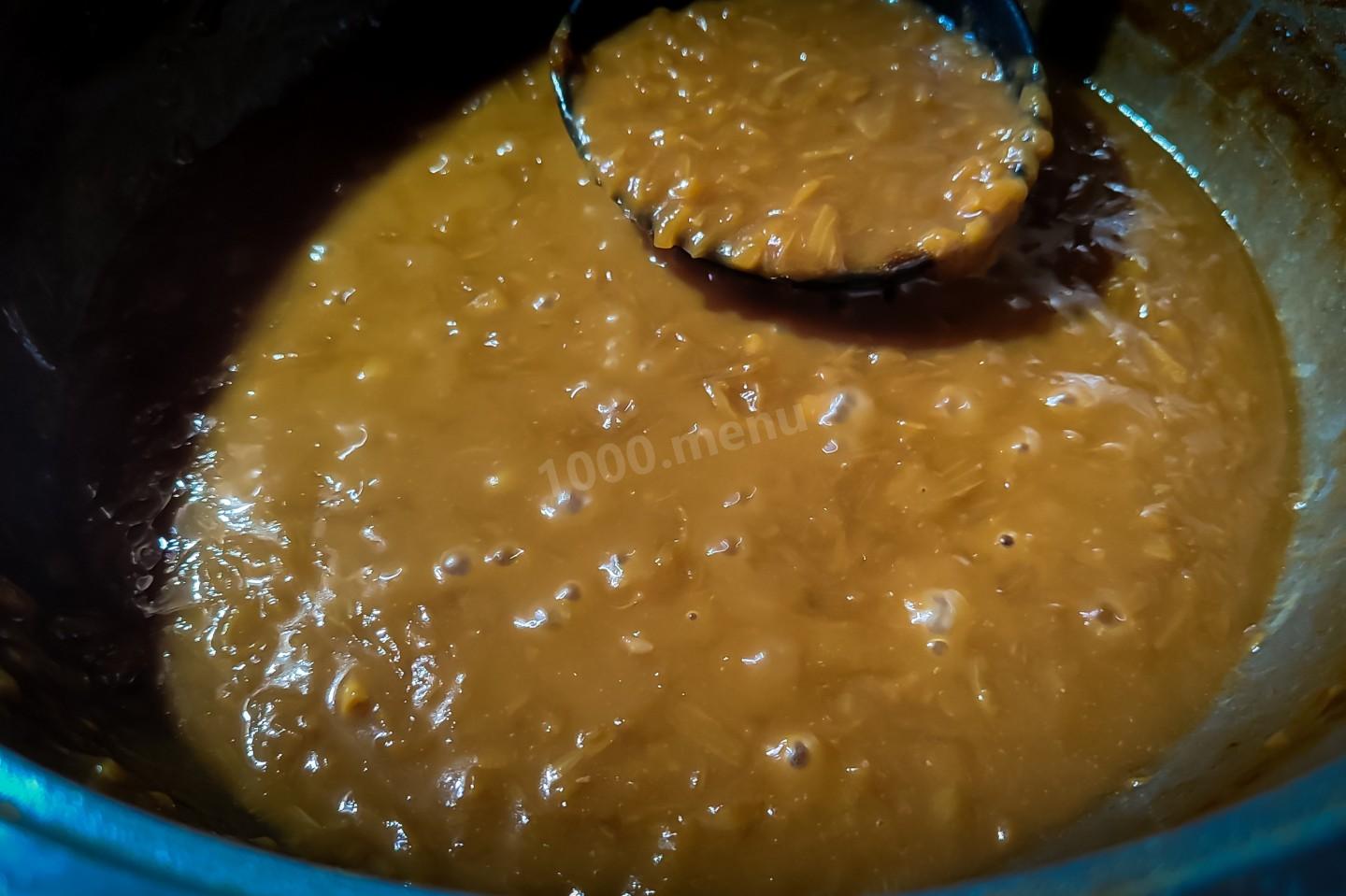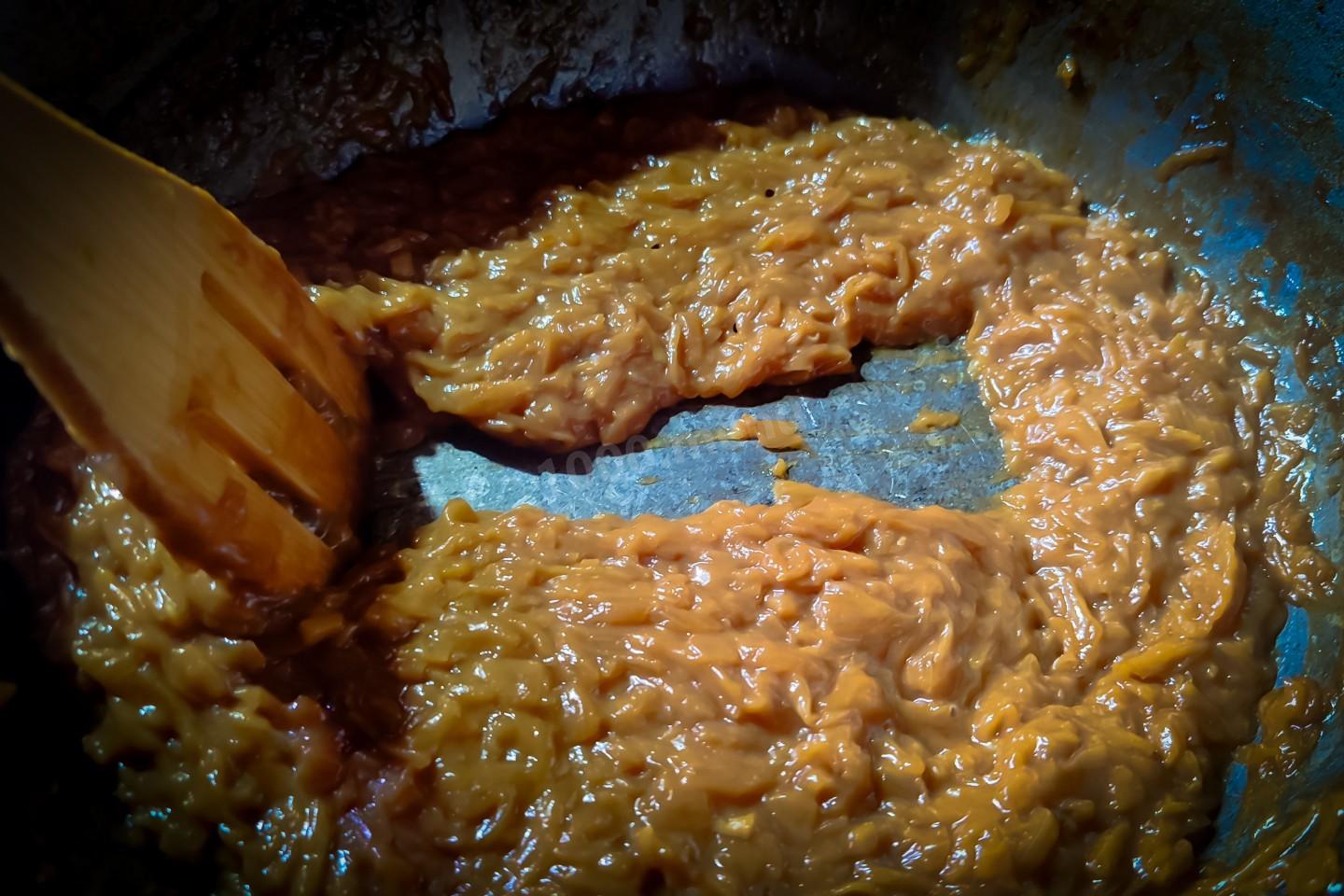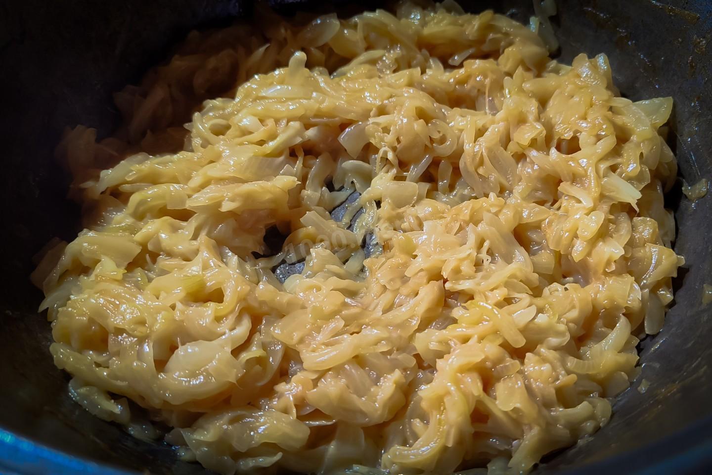 Когда лук примет коричневый оттенок, но не подгорит (у меня на это ушло 1,5 часа), можно приступать к следующим шагам.