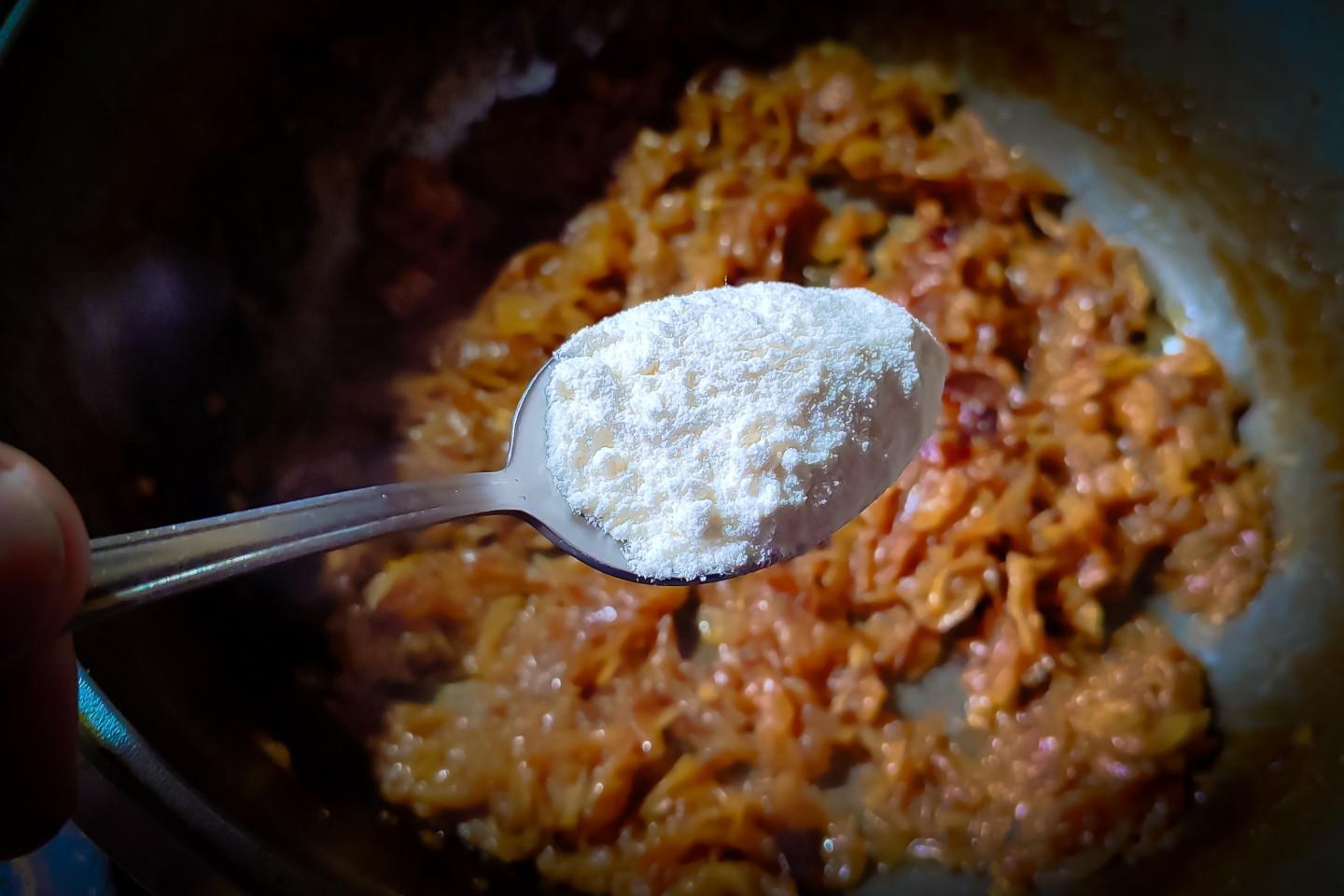В лук всыпать равномерно 1 лужку пшеничной муки, хорошо перемешать. И вымешивать ещё в течении 5 минут. Лук примет более густую консистенцию. Нужно постоянно перемешивать и не давать прилипнуть ко дну.