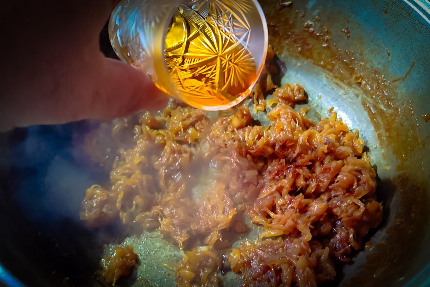 Через 5 минут в лук влить коньяк. Алкоголь быстро выпарится, но аромат останется.