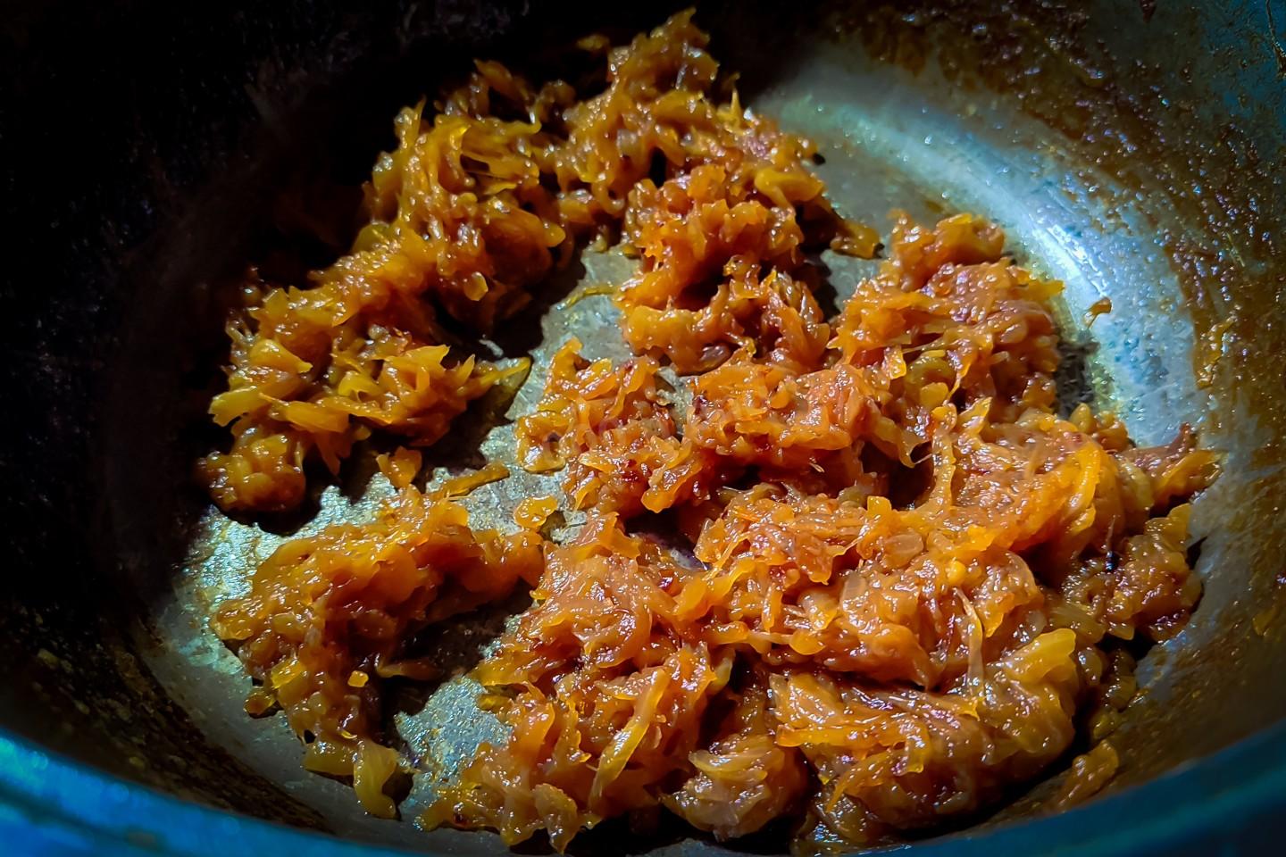 Если по дну кастрюли с луком провести лопаткой, то он не сразу должен принять первоначальный вид, а постепенно слиться воедино.