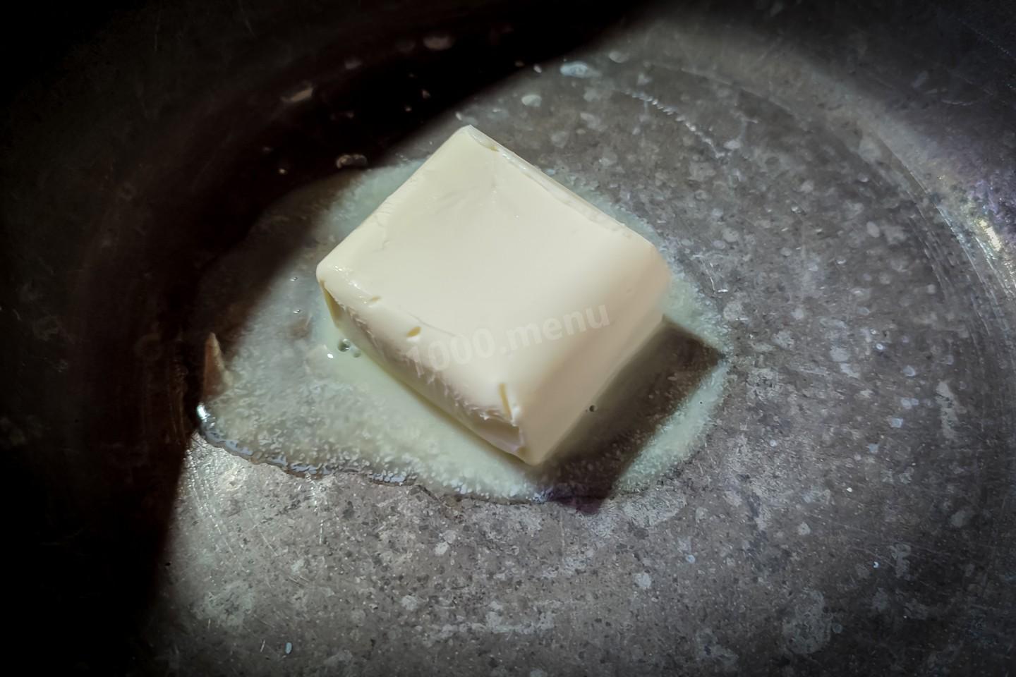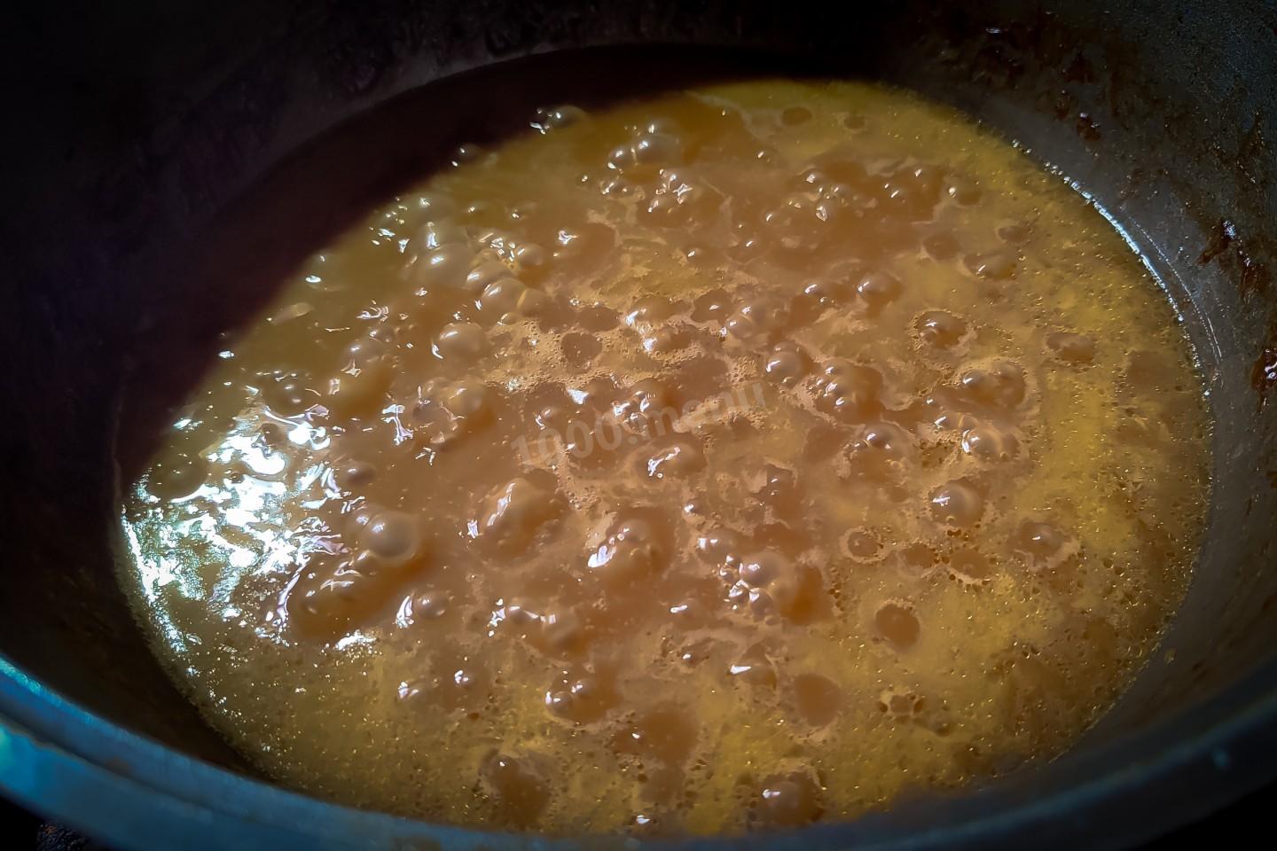 В разогретую кастрюлю с толстым дном (в моём случае это алюминиевый казан) выложить сливочное масло и разогреть, пока оно не растает. Сильно греть не надо, чтоб не стало подгорать.