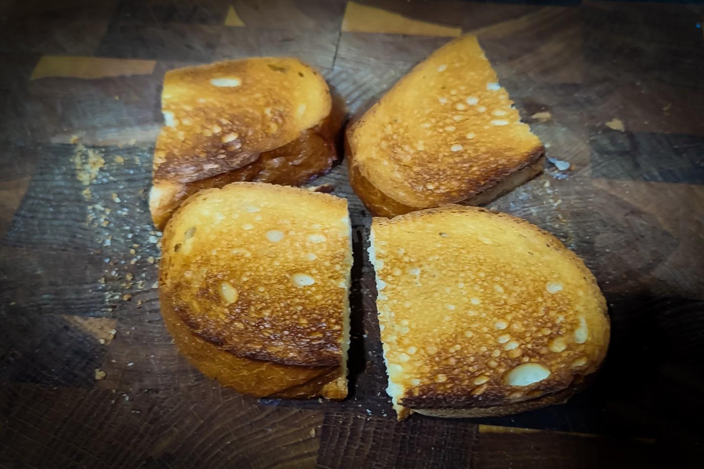 Кусочки белого батона обжарить на сковороде с двух сторон или обжарить их в тостере до хрустящей корочки.