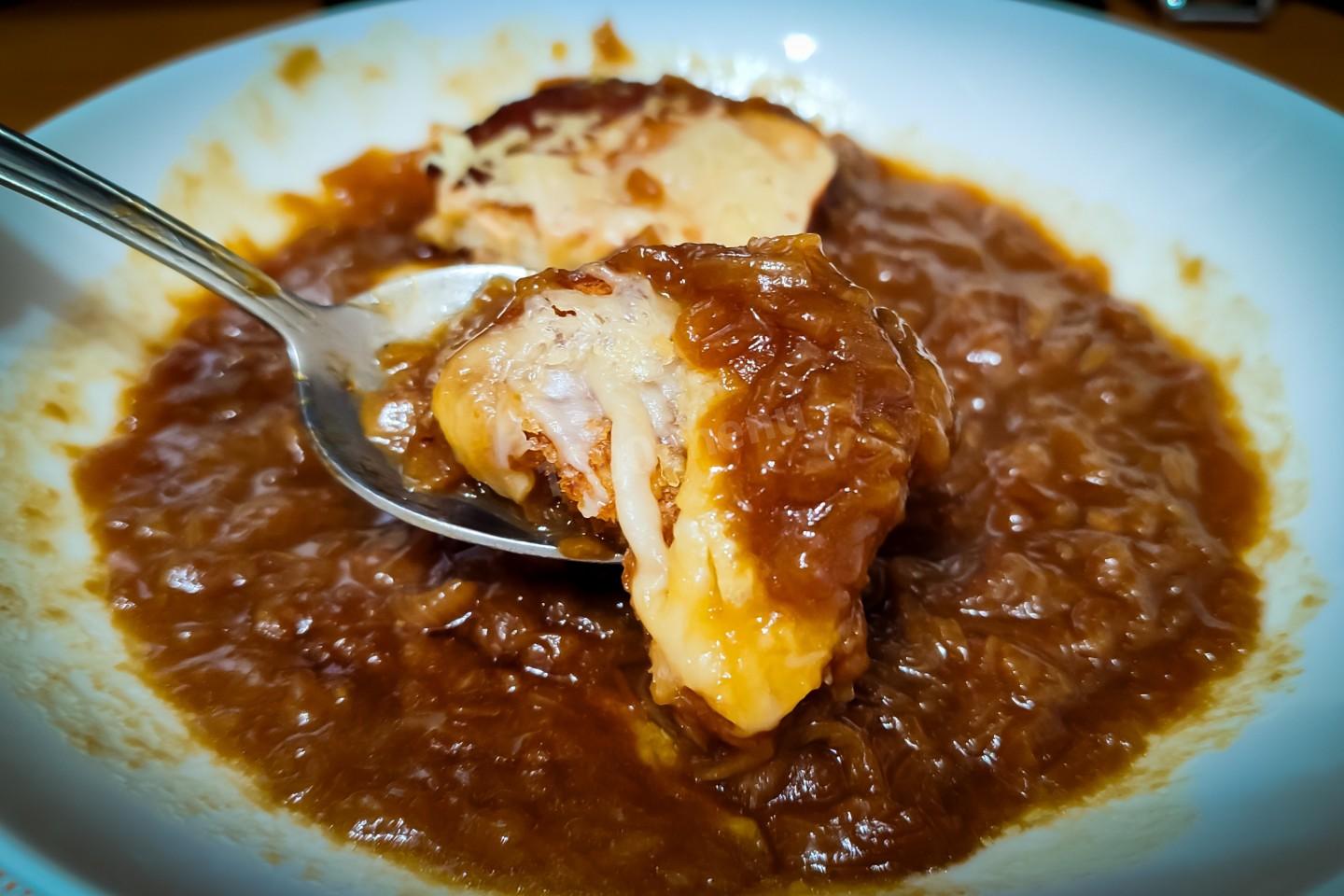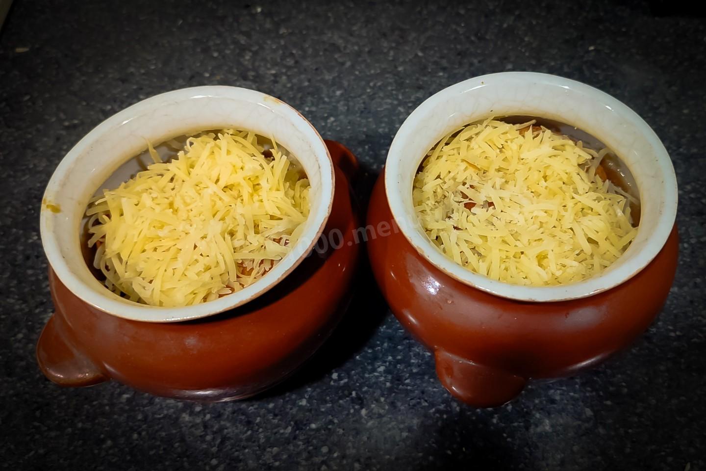 В горшочек, поверх лука, положить обжаренные кусочки батона (можно целые, если они войдут, я разрезал на 2 части), а сверху присыпать натёртым сыром. Всё это надо делать быстренько, чтоб батон не пропитался луковым бульоном. Если у Вас есть желание, то обжаренный батон можно сверху натереть чубчиком чеснока.