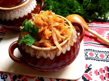 Никогда не тушила капусту в духовке, захотелось узнать что получится. Квашеная капуста у меня была домашняя. Перед приготовлением промыла её холодной водой и откинула на сито, чтобы стекла лишняя жидкость. Пропорции продуктов увеличила в 1,5 раза просто изменив количество порций. Лук и морковь поджарила на сковороде, а потом смешала с капустой. Добавила только сахар, т. к. капуста и так была солёная и заквашивалась с душистый перцем. Сначала не хотела использовать сахар, но как оказалось, он просто необходим для баланса вкуса. Овощи разложила по трём горшочкам. В процессе запекания два раза перемешивала и один раз подлила воды. В духовке держала один час. Капуста действительно немного осела, но не сильно. Квашеная капуста в духовке тушеная получилась просто чудесной! Даже лучше, чем на сковородке. Она осталась чуть хрустящая, приятного цвета, вкус сбалансирован. Четко ощущается вкус квашеной капусты, но он более мягкий. Однозначно рецепт рекомендую.