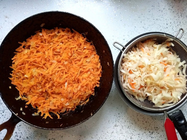 Переложите наши обжаренные овощи в миску к отжатой капусте и все хорошо перемешайте. Добавьте сахар, черный молотый перец, по вкусу и снова перемешайте.
