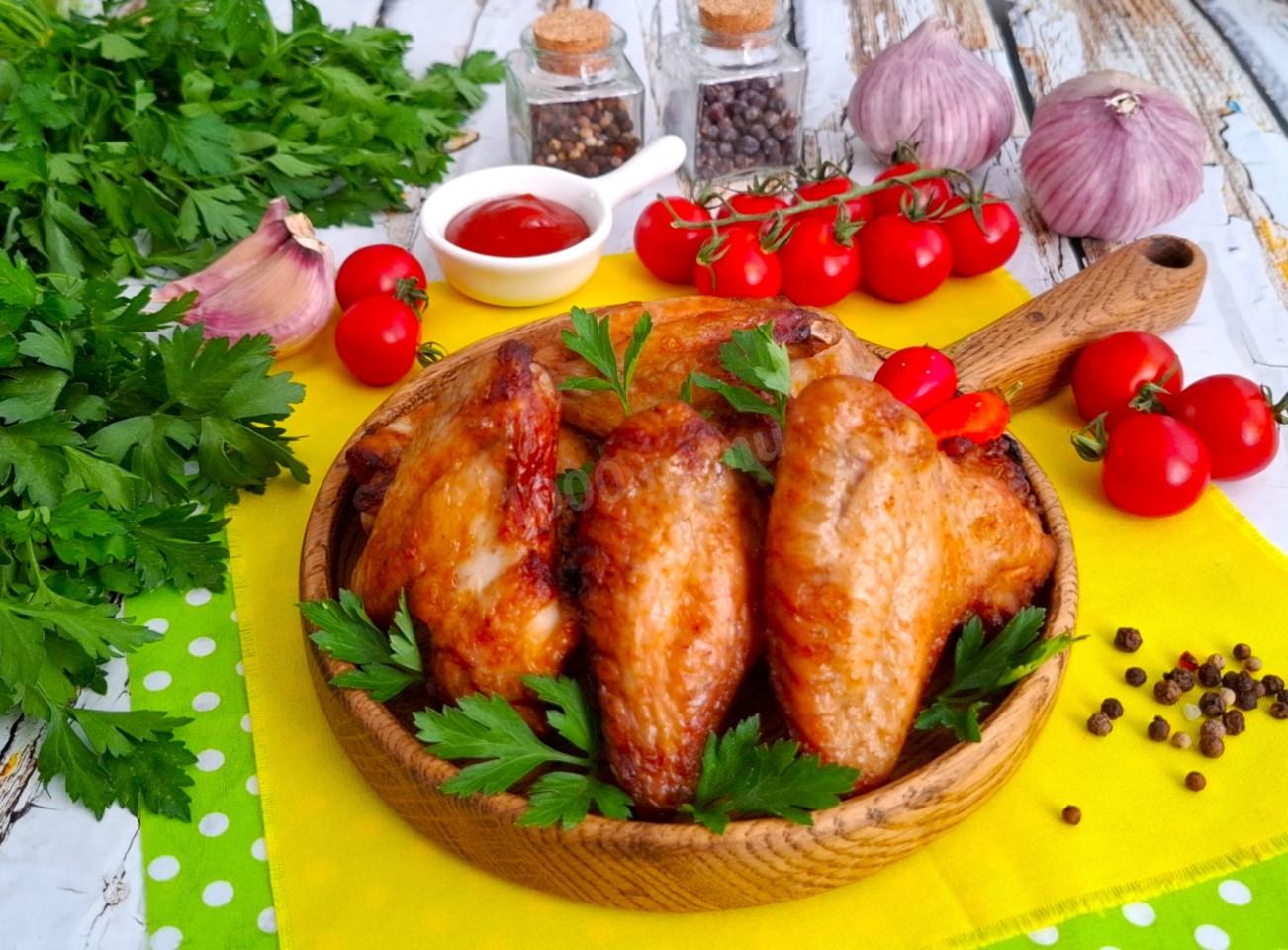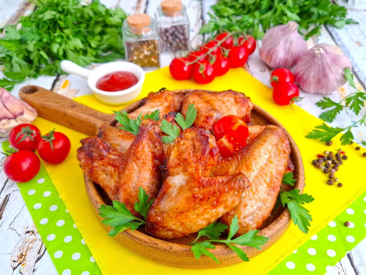 Подавайте крылышки сразу после приготовления — так хрустящая корочка сохранит текстуру. Выложите их на деревянную доску или тарелку, по желанию сбрызните свежевыжатым лимонным соком для усиления вкуса. Дополните блюдо соусами, свежими овощами, гарниром — картофелем фри, овощами-гриль или кукурузой. Украсьте веточками свежей зелени. Приятного аппетита!