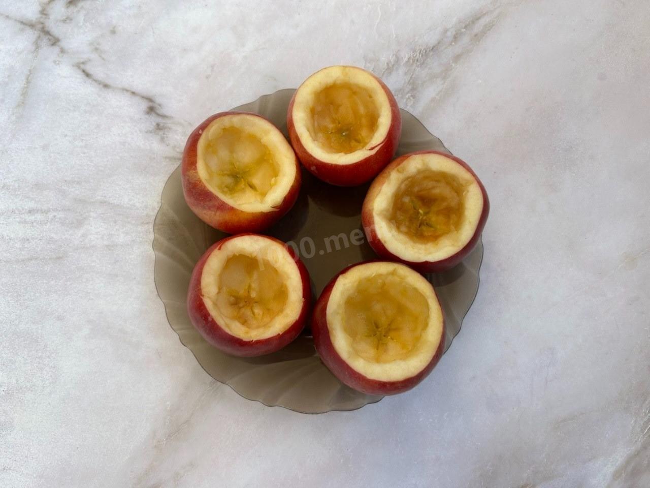 Промойте яблоки, срежьте верхушки (в виде крышечки) и аккуратно удалите сердцевину чайной ложкой, стараясь оставить дно целым.
