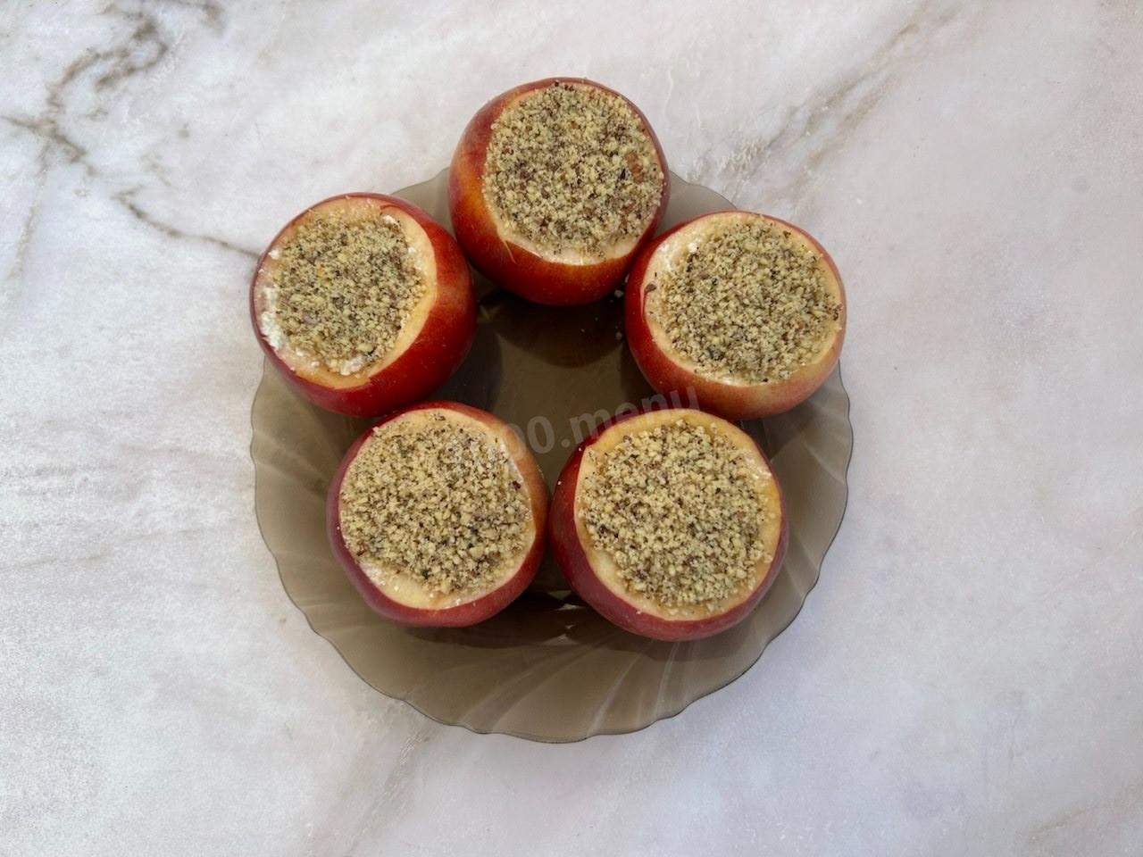 Грецкие орехи измельчите в мясорубке, блендере или мелко порубите ножом. Яблоки посыпьте сверху измельченными орехами. Накройте яблоки срезанными крышечками, переложите их на решетку аэрогриля, застеленную фольгой или пергаментом, или выложите яблоки в форму для запекания. Я использовала форму для запекания. Отправьте яблоки в чашу аэрогриля.