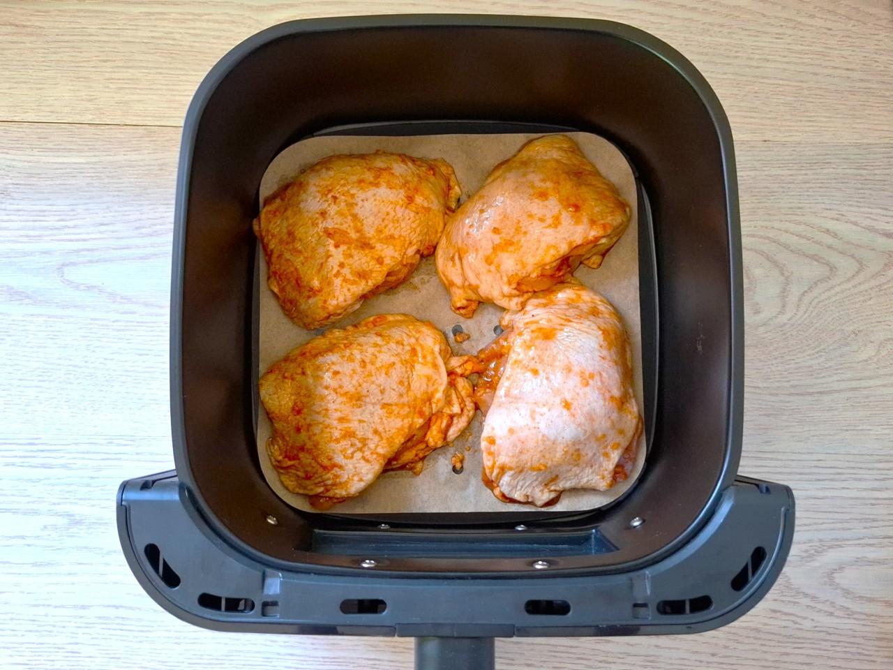 Чашу застелите пергаментом, у меня он с отверстиями. Кусочки курицы очистите от лука и чеснока и выложите в чашу аэрогриля на расстоянии друг от друга. Можно использовать силиконовую форму или выложить курицу на решетку, смазанную растительным маслом. Не перегружайте решетку аэрогриля, чтобы горячий воздух мог свободно циркулировать и равномерно пропекать курицу со всех сторон. Подробнее о выборе пергамента читайте в статьях по ссылкам под шагами.