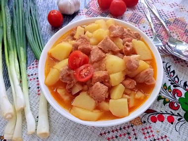 Нарезав свинину, обжарила ее на растительном масле до румяной корочки. Добавила лук, чуть позже муку и томатную пасту. Перемешала, посолила, залила горячей водой так, чтобы она полностью покрыла мясо. Тушила свинину под крышкой, пока та не стала мягкой. После этого добавила нарезанную брусочками картошку и тушила ее под крышкой до готовности. Всё достаточно просто! А результат отличный! Обязательно буду готовить по рецепту в дальнейшем!