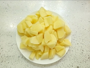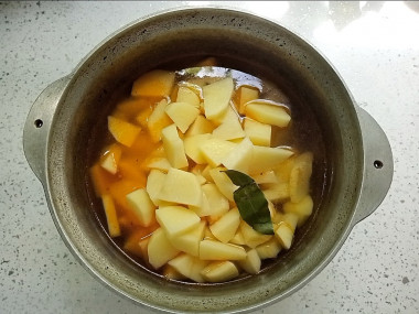 Картошку я нарезала средними ломтиками для удобства. Тушила все вместе 15 минут. Но нужно ориентироваться на готовность мяса и картошки. Специи я не добавляла, только лавровый листочек.