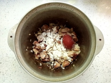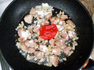 У меня был кусочек свиного карбоната, который я нарезала и обжарила. Затем выложила к мясу лук, нарезанный кубиками и еще немного прожарила. Добавила муку и томатную пасту. Все перемешала и тушила пол часа, т. к. мясо оказалось жестковатым.