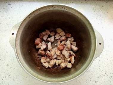 Мясо нарежьте небольшими кусочками. Сковороду берите глубокую. Разогрейте её до горячего состояния и налейте немного растительного масла. Выложите подготовленное мясо и обжарьте его на сильном огне со всех сторон, чтобы оно слегка начало поджариваться.
