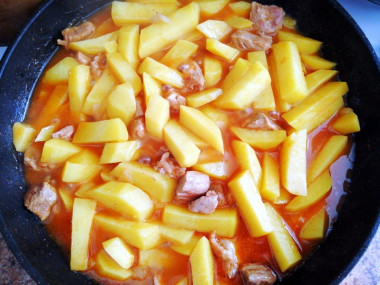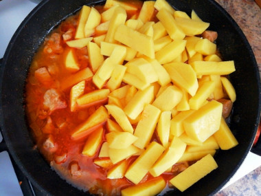 Выложите картофель в сковороду. Перемешайте. Количество воды можно увеличить в зависимости от того, какой консистенции готовое блюдо вы хотите получить. Я люблю, чтобы подливки было больше. Тушите картофель вместе с мясом ещё минут 20-25. Картофель должен стать мягким.