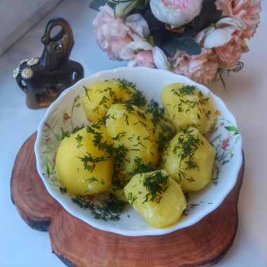 Такой простой рецепт: картофель отварной,но такой вкусный! Картофель очистила,у меня был небольшой,я не разрезала. Отварила до готовности,слила воду. Добавила сливочное масло, измельченную зелень укропа. Закрыла крышкой и немного потрясла кастрюльку,чтобы масло и укроп равномерно распределились. Выложила в тарелку и ещё немного посыпала укропом. Ароматно и очень вкусно получилось!