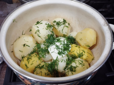 В кастрюлю с картофелем положите кусочек сливочного масла и укроп. Кастрюлю накрываем крышкой и пару раз встряхните, чтобы масло и укроп равномерно разошлись по кастрюле с картофелем. Кстати, если вы переварите ваш картофель, то в процессе встряхивания он может развалиться практически до пюре, поэтому хорошенько следите за картофелем во время его приготовления.